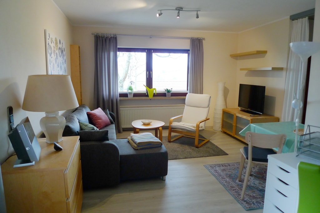 El apartamento de vacaciones es un apartamento de aprox. 40 metros cuadrados de 1 habitación con cocina americana amueblada y mesa de comedor; 3 lugares para dormir y sofá cama; baño con bañera; TV y WiFi; incl. Ropa de cama y toallas. Habitaciones para no fumadores. Área de barbacoa en la casa. Hay un estacionamiento disponible frente a la casa. Las habitaciones han sido recién reformadas. La fachada exterior del edificio está actualmente sin limpiar. Pedimos disculpas por esto.