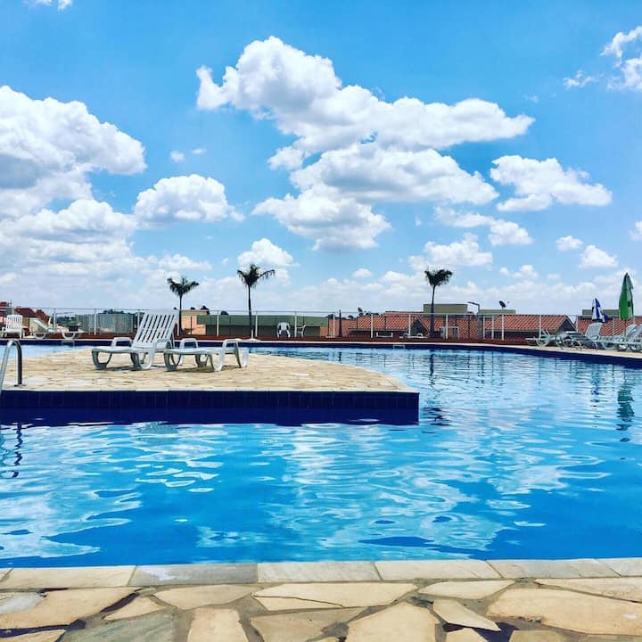 Desfrute de camas Queen confortáveis, uma churrasqueira para momentos de lazer e uma Jacuzzi aquecida para relaxar. Com sol na maior parte do ano, nosso espaço oferece tranquilidade e bem-estar. O clube completo conta com academia, uma piscina ampla, quadras de tênis e vôlei, campo de futebol e salão de jogos. É o local ideal para toda a família! Animais de pequeno porte (até 10kg) são bem vindos (mediante taxa Pet)!