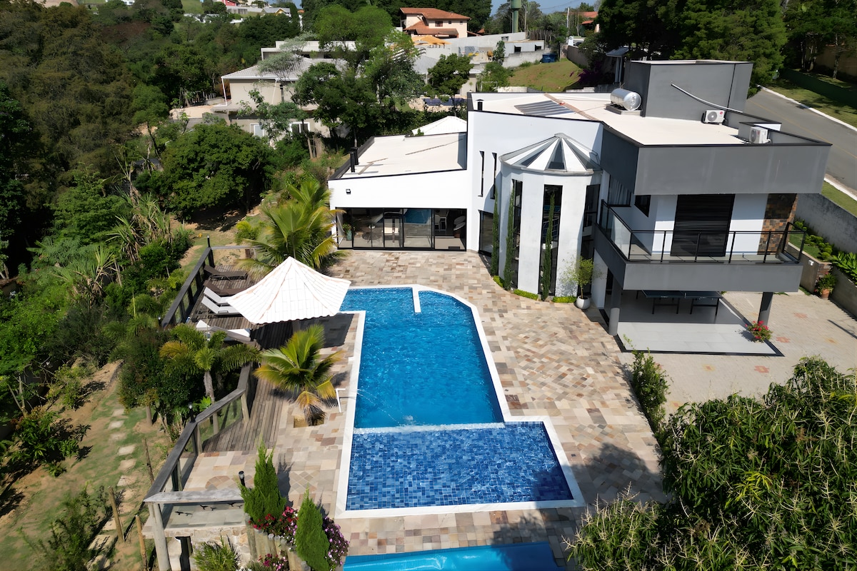 ¡Lugar para momentos inolvidables a 45 minutos de SP! Condominio cerrado y seguro. Internet de 400 Mbps. Capacidad 17 personas en 5 dormitorios (3 suites), 7 baños. Ropa de cama/baño. Cocina gourmet y estufa de leña. Chimeneas. Piscina climatizada e iluminada. Quiosco. con barbacoa. máquina de hielo., TV, congelador, cocina, nevera y estéreo. Cancha de tenis estándar ATP iluminada. Gimnasio profesional. Sala de juegos completa. Aire acondicionado en todos los entornos. Limpieza máxima. Todo en la casa funciona perfectamente. Todo vallado.
