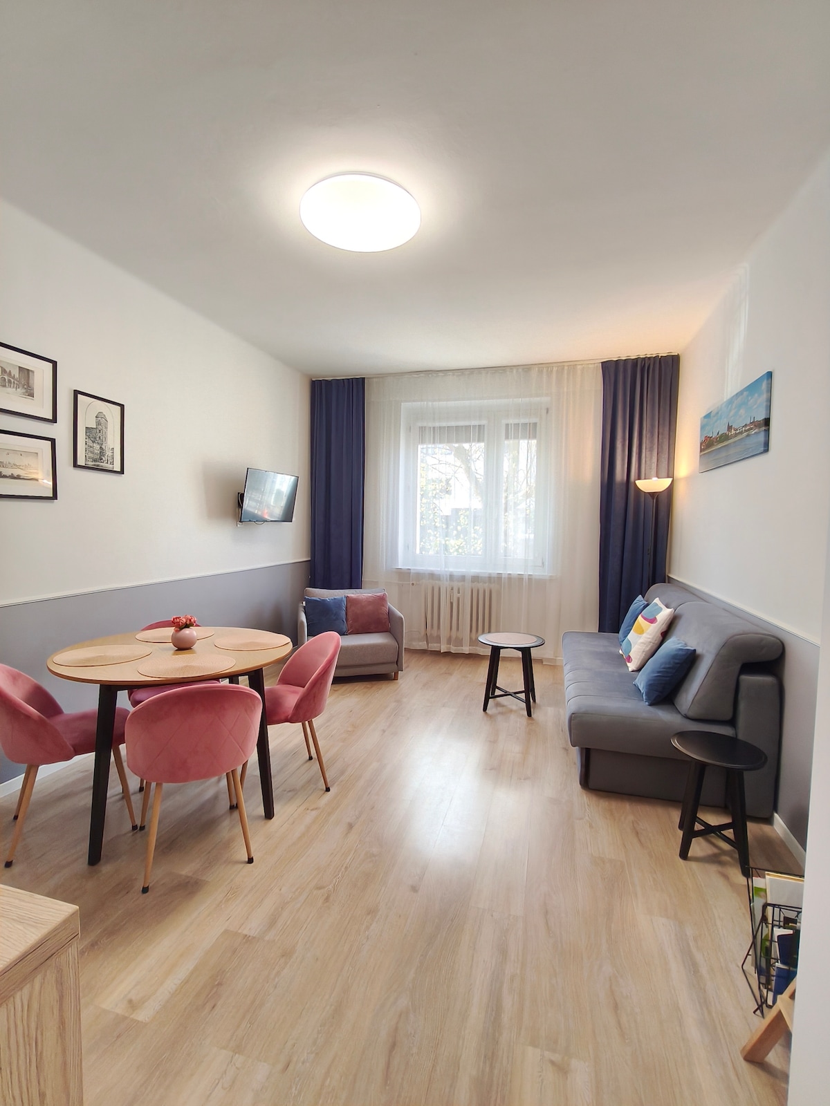 Bienvenido a nuestro apartamento único, ubicado en una hermosa casa de vecinos francesa neorrenacentista, justo al lado de la Catedral de los Santos Johns, en el corazón del casco antiguo de Toruń, declarado Patrimonio de la Humanidad por la UNESCO. El apartamento ofrece 62 m² de espacio y un ambiente distintivo. Cuenta con una sala de estar espaciosa y luminosa (36 m²) con un sofá plegable y una zona para dormir con una cama cómoda. La cocina totalmente equipada con comedor (21 m²) también incluye un segundo sofá plegable.