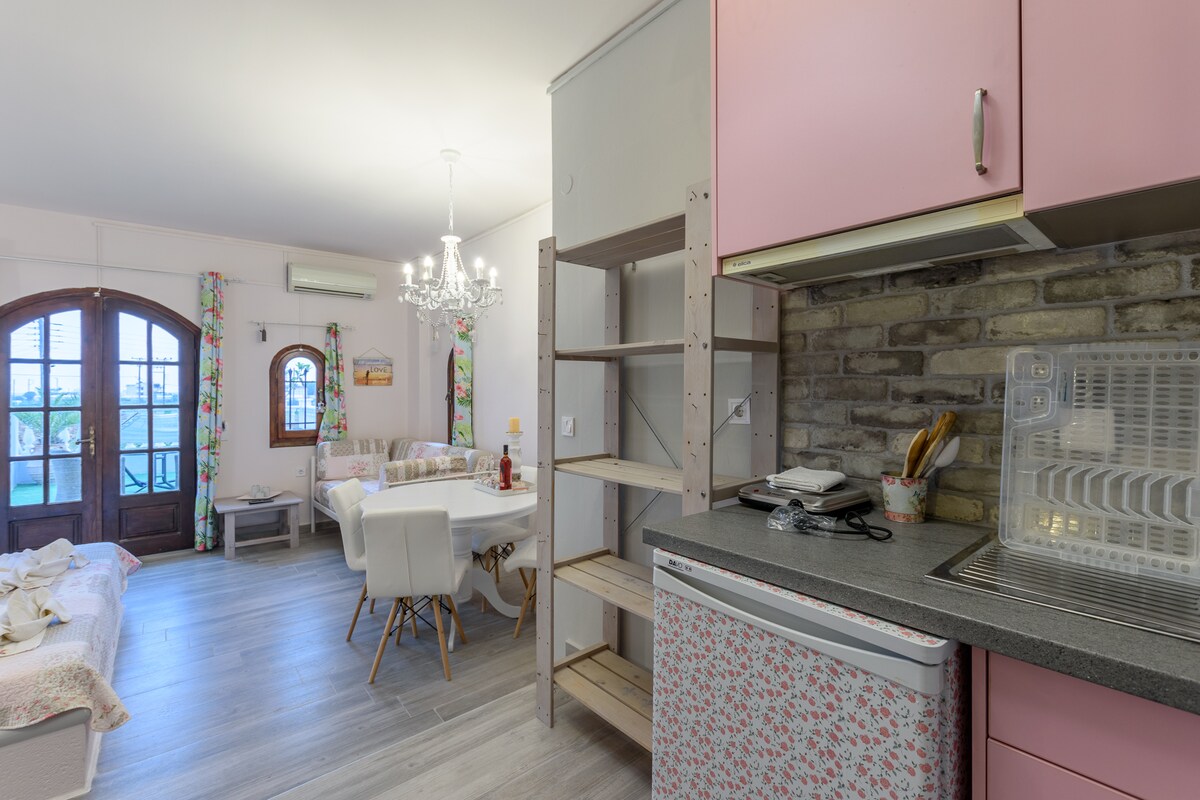 Es un apartamento decorado con estilo isleño, azul y blanco. El color azul del mar y la espuma blanca de las olas (las diferentes decoraciones de cada habitación las hacen únicas y te dan la sensación de evasión) con una pequeña cocina, WC, balcón o patio con vistas al mar. El complejo se encuentra entre dos playas: la tranquila playa de Lygaria y la cosmopolita playa de Agia Pelagia. Estamos a 16 minutos en coche del aeropuerto de Kazantzakis y a 18 minutos del puerto de Heraklio (llegada-salida de Santorini, Pereus).
