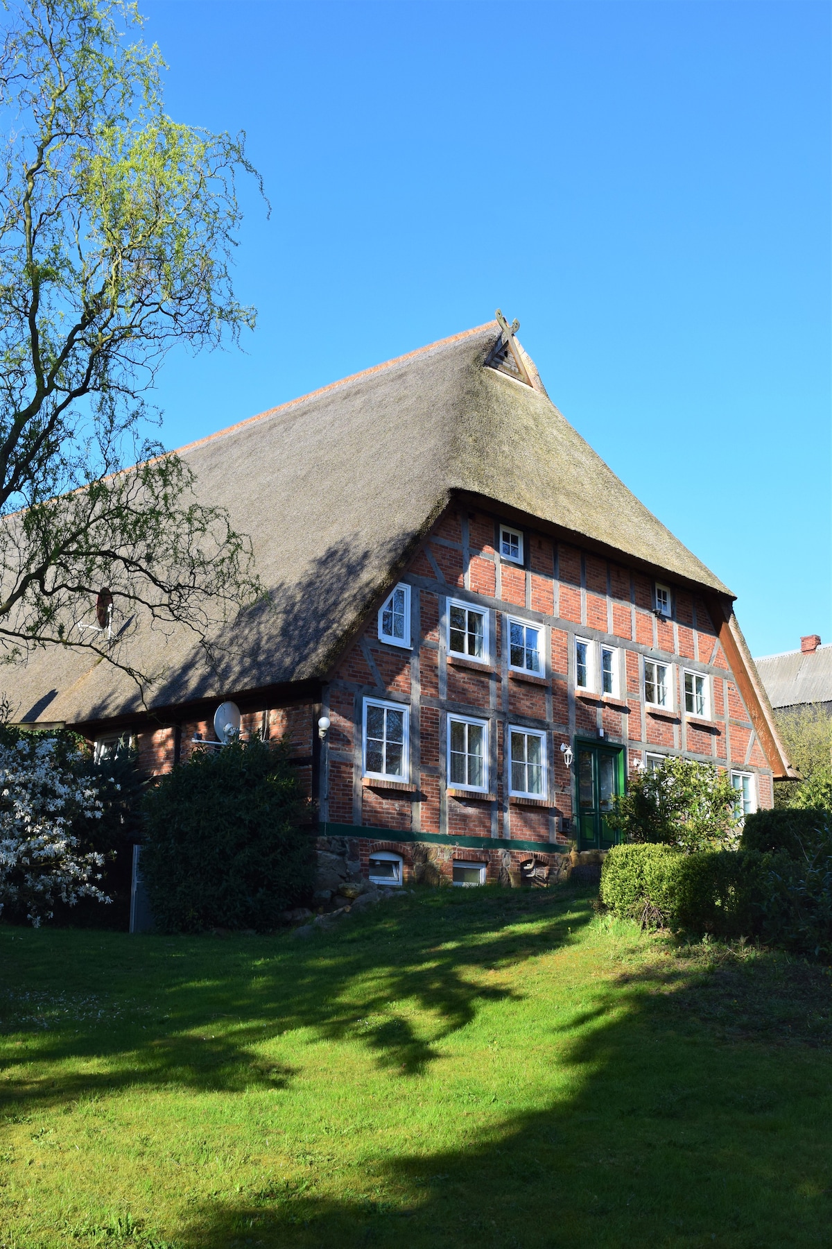 Apartamento vacacional BehrenSCHLAF Alójese en una casa de campo con tejado de paja y descubra la naturaleza y el paisaje. La casa de campo, construida alrededor de 1780 como una casa de humo, es un edificio protegido y se ha conservado con cariño. Pasaréis la noche en nuestro acogedor apartamento con terraza orientada al sur y vistas a nuestro jardín. Una cama doble y un sofá cama plegable permiten que 2 huéspedes duerman cómodamente, pero también es posible que duerman 4 personas. ¡Os esperamos! La familia Behrens