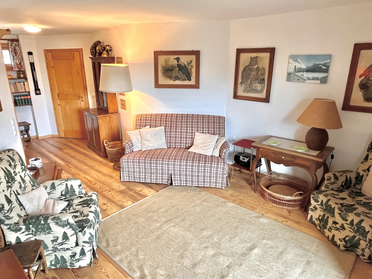 Apartamento de 3 1/2 habitaciones en la planta superior, enorme salón, terraza, vistas. 2 dormitorios, el grande con una cama doble, el pequeño como una habitación de invitados con una cama normal. Ubicado en el centro pero muy tranquilo, aparcamiento a la vuelta de la esquina, infraestructura a pocos minutos. Campo de golf, baño mineral, aeródromo y muchas rutas de senderismo. Relajación para 2 - 3 personas, wifi, TV vía satélite, cafetera espresso con café gratis. Contacto en italiano, alemán, inglés, francés, español o romanche.