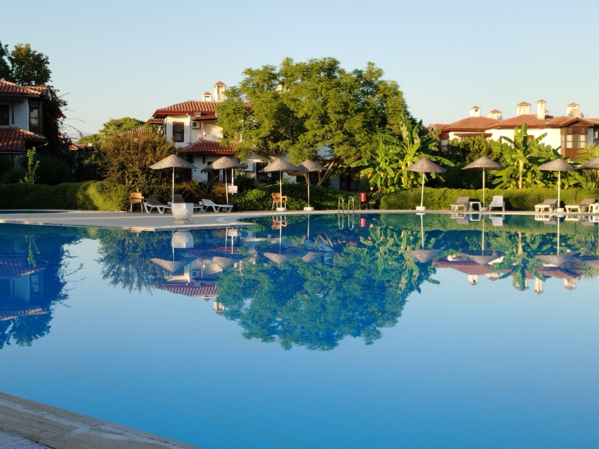La casa es bastante espaciosa y adecuada para muchas personas. Ubicada dentro del sitio de Yenikent, esta casa tiene una piscina al aire libre para uso del sitio y su propio negocio costero. Hay 2 dormitorios individuales y 1 dormitorio principal, y también hay un sofá cama en la planta baja. Ubicado en la planta superior, la azotea, con 3 fachadas y zona de barbacoa, el patio ubicado en la entrada, que está en la entrada, se puede evaluar para tomar café en las mañanas de verano. Tienda de comestibles disponible en el sitio. Descripción del transporte