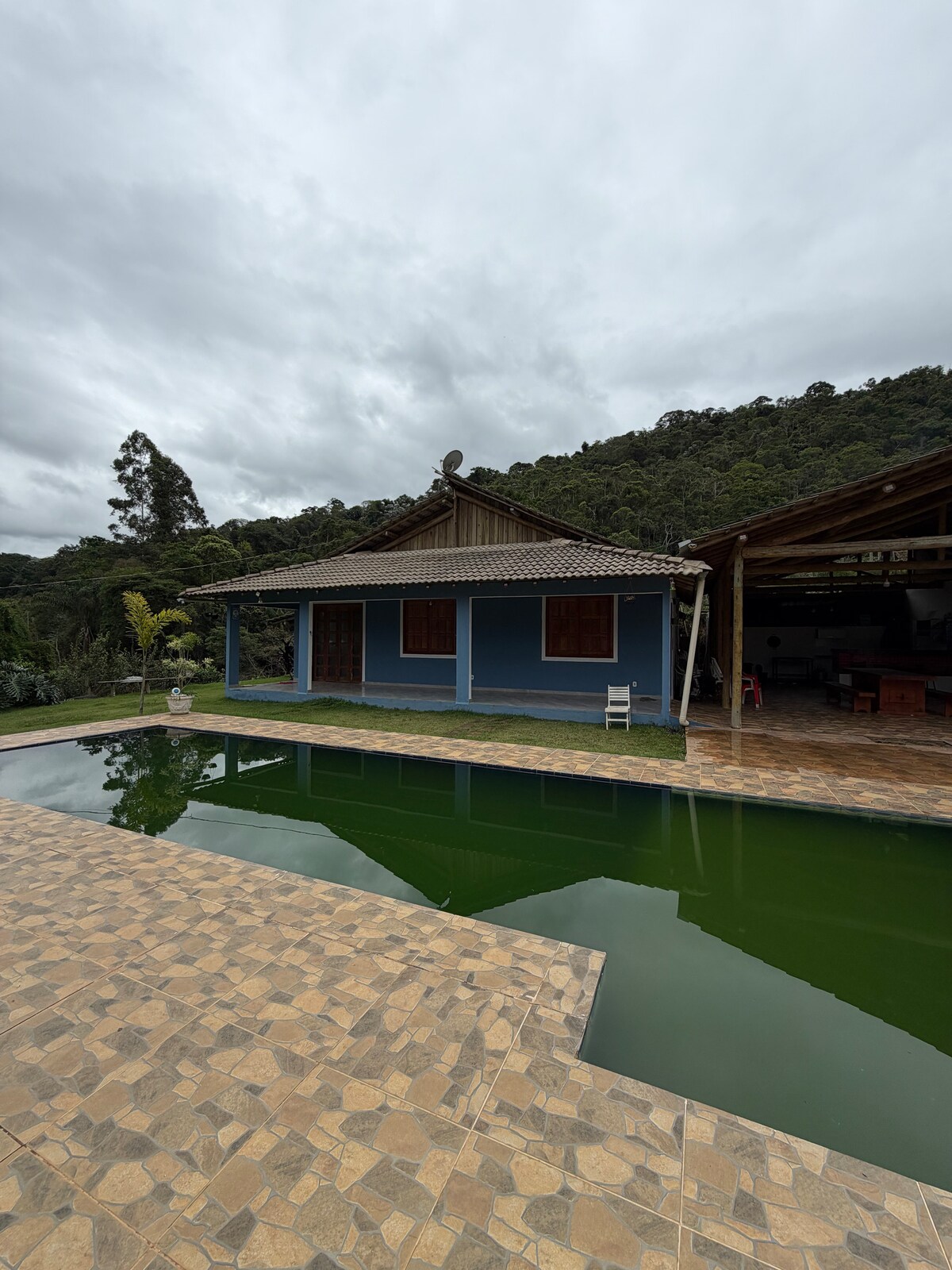 Relaxe com toda a família nesta acomodação tranquila. A apenas 3,5km de Manhuaçu, esta casa em meio à natureza é ideal para descanso e lazer. Com 4 quartos (incluindo uma suíte), acomoda até 10 pessoas e conta com cozinha completa, sala com TV e internet. A área externa dispõe de piscina, churrasqueira, redes, espreguiçadeiras, totó, banheiro externo, além de estacionamento e segurança por câmeras. Perfeita para comemorações, podendo acomodar mais pessoas na área da piscina (sob consulta).