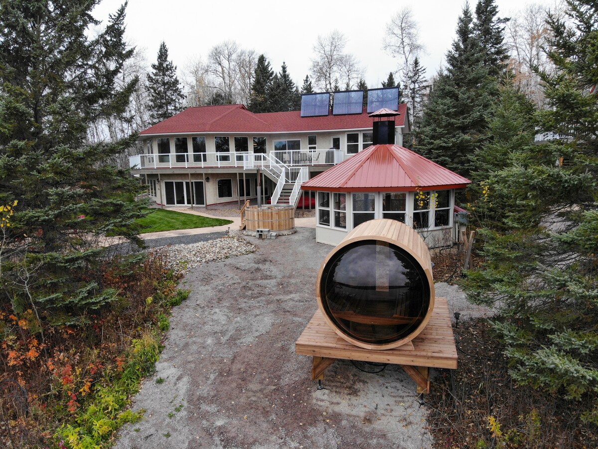 Alquiler de lujo: 4 Seasons Bird River Paradise en el puerto de Marleau. Solárium, terraza envolvente, chimenea al aire libre, chimenea protegida, bar Tiki, bañera de hidromasaje japonesa de leña, sauna con vista panorámica, esquí de fondo, raquetas de nieve, motos de nieve, trineo (150' de carrera), canoas, barco de pedales, horno de ladrillo para pizza, ducha al aire libre ¡Escapada de invierno, diversión de verano, relajación, vacaciones de lujo, retiros de empresa, luna de miel, lugar para bodas! ¡Esta es una casa familiar dirigida por nuestra familia para que otras familias disfruten!