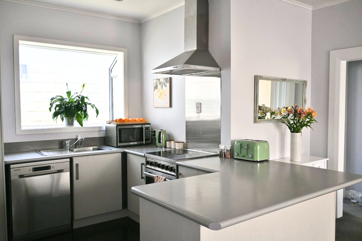 Peaceful, comfortable, and close to all that Gisborne has to offer. Walk to the main street, to food and takeaways and bottle store, and the best pies at Bakery 22. Just a two minute walk to the Botanical Gardens and the Taraheru river, and a scenic stroll across the footbridge up to the Ballance St Village. Enjoy a longer walk connecting with the walkway to Waikanae Beach, or take a quick drive to Gisborne's beautiful beaches. Or simply relax in the large garden with mature fruit trees.