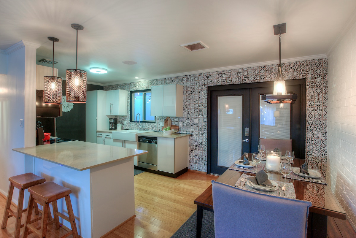 El histórico distrito Willo de Central Phoenix es el lugar perfecto para relajarse. Cerca de muchas atracciones y de las principales autopistas, esta casa de mediados de siglo completamente renovada ofrece lo último en lujo y accesorios de alta gama. En el interior, puedes mimarte en la bañera profunda (con agua caliente sin fin) o en la ducha de varios grifos, acurrucarte en las lujosas camas o simplemente descansar frente al televisor 4K de 65 pulgadas. En el exterior, puedes relajarte junto a la piscina (pregunta sobre la calefacción) o simplemente reunirte bajo el patio sombreado.