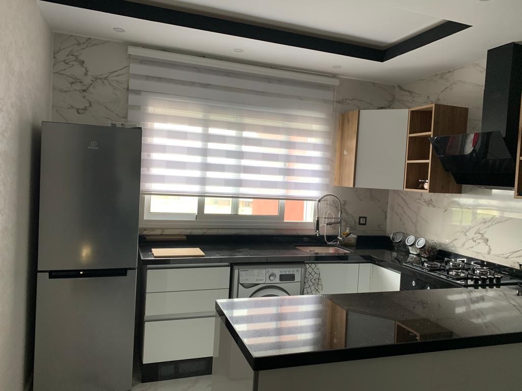 bonito apartamento elegante, bien cuidado, estilo americano, 2 dormitorios, un dormitorio para adultos con pequeño balcón, otro con dos camas con balcón abierto a la fachada, que contiene una mesa de café. una sala de estar abierta a la cocina. hay dos baños,uno en el dormitorio para adultos. apartamento equipado, la residencia está cerca de todos los servicios, ( avenida mohamed 5, cerca de café aji dou9) . ascensor, cámara y espacio para perderse. A 5 minutos de la playa en coche, a 20 minutos a pie.