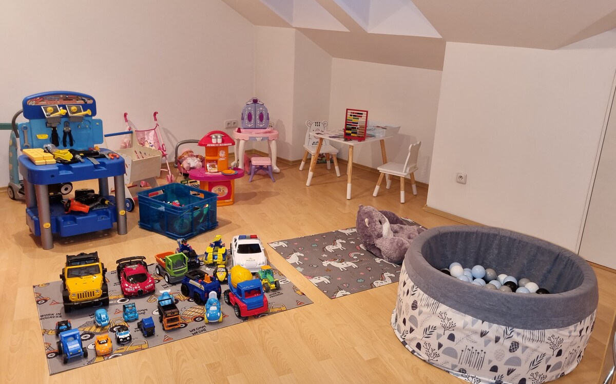 Lleva a toda la familia a este gran lugar con un espacio separado excepcional para divertirte y jugar en un espectacular parque infantil de hasta 50 m2 y un montón de juguetes y un movimiento seguro para tus familiares favoritos. El apartamento está ubicado en una parte tranquila y segura de la ciudad con aparcamiento de garaje incluido. Altura máxima del coche de hasta 1,8 m. Hay 140m2 de espacio habitable, habitaciones amplias, sala de juegos grande, 2 baños . Cabe destacar que el departamento es en el cuarto piso SIN TI