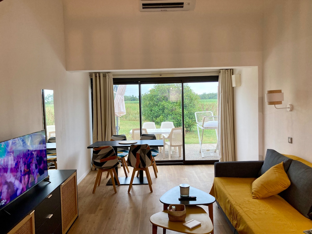 Maison de vacances au coeur du Village Camarguais à Arles. Vous disposez d’une terrasse avec vue sur la nature. Séjour spacieux et climatisé, cuisine refaite à neuf équipée (plaques induction, micro-ondes, lave-vaisselle,...), deux chambres (chambre double, et petite chambre avec lits superposés), salle de bains avec baignoire. L’accès à 2 piscines est assuré du 15 juin au 15 septembre (voir les photos)