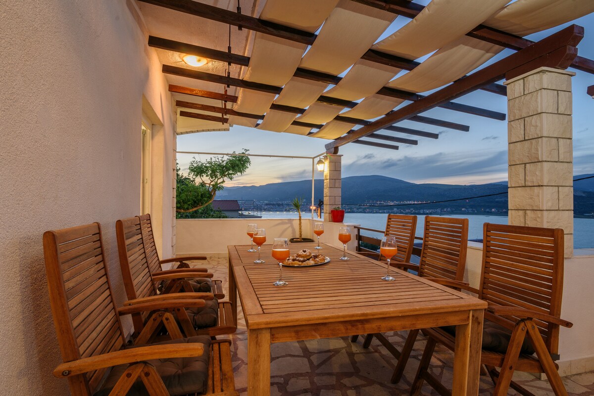 Enyoj this spacious and sun-field apartment designed to make you feel at home. The proximity of the beach 60 m, incredible and open view of the blue sea and sky and all the necessary facilities with which the apartment is equipped, allow the guest to have an ideal vacation from busy everyday life. The proximity of the city of Trogir 4 km, the city of Split 30 km and airport Split 8 km are within easy reach. All this makes this place an ideal place for your beautiful and relaxing vacation.