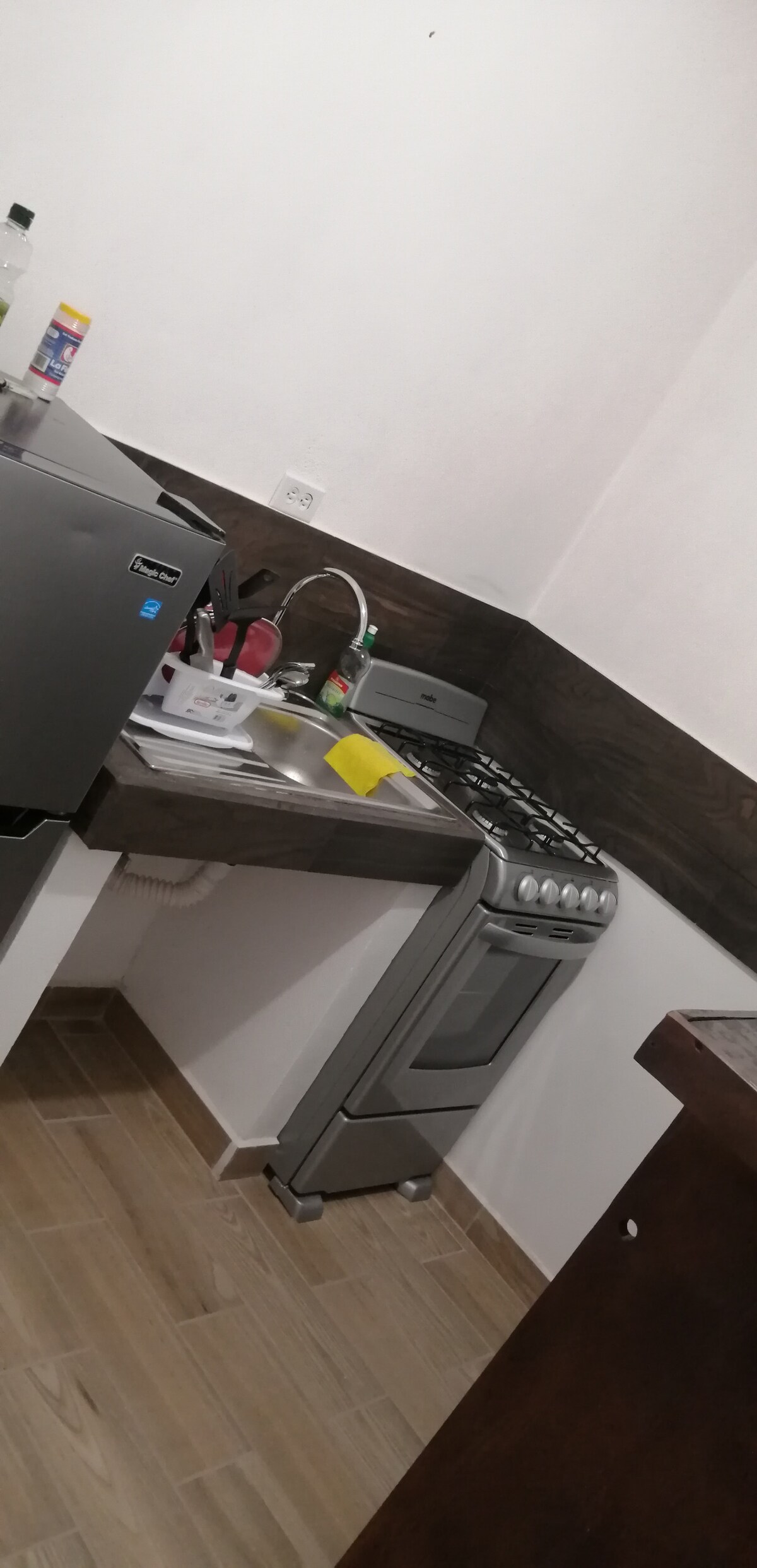 Departamento amplio con pequeña cocineta(refri,micro,tabla adosada a pared como desayunador). Baño completo con agua fría y caliente,con barras ayudadoras. Cama QUEEN ,TV Smart 40". Internet.Estacionamiento dentro de la propiedad.