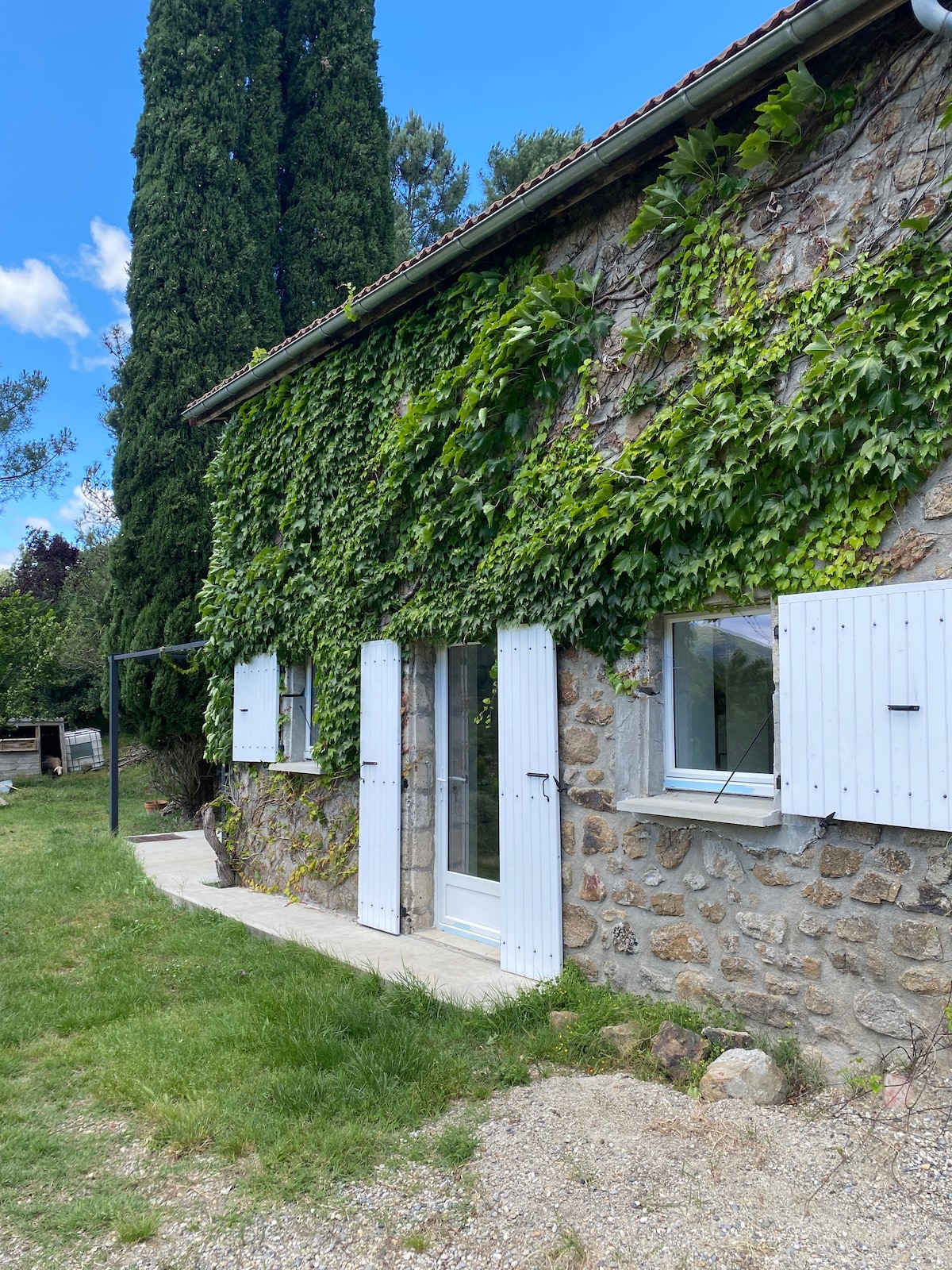La escapada perfecta en el corazón del Ardeche con impresionantes vistas al valle y a pocos pasos de los populares lugares de baño del pueblo. Situado justo al lado de la gran casa de campo, es ideal para los amantes de la naturaleza a los que les gustan las comodidades de la vida moderna. Tiene su propia entrada, jardín y terraza para comer al aire libre, tomar el sol y contemplar las estrellas. Hay pequeños detalles como un lavavajillas, un tocadiscos de vinilos y equipamiento para los amantes del café. Tu propia plaza de aparcamiento está a 3 minutos a pie.