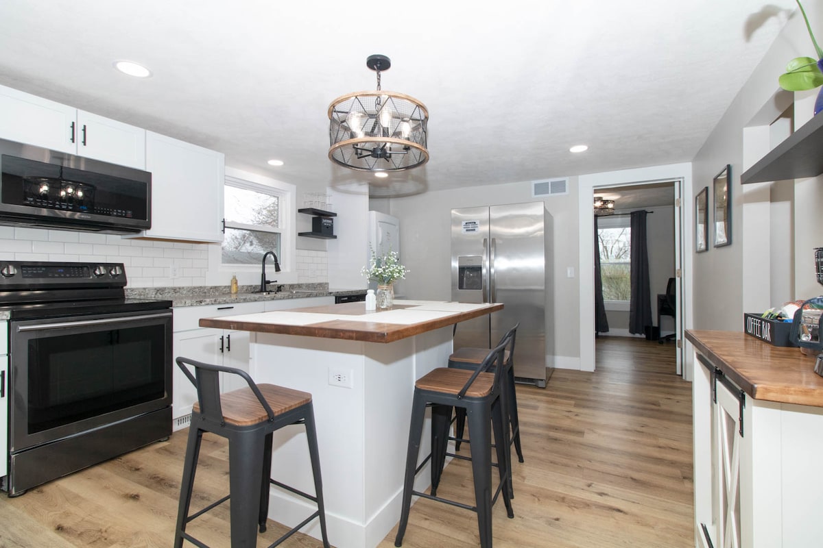 Llena de luz y acurrucada entre los árboles maduros del barrio de Maplewood. Esta casa de ladrillo de una sola planta tiene una ubicación céntrica; cerca de Uptown y Downtown, los campus de ISU e IWU y a menos de 10 minutos de Rivian y State Farm. Recién reformado y diseñado con una estética moderna, nuestros huéspedes vienen a explorar Bloomington/Normal, pero nos dicen que están igual de felices pasando el tiempo y relajándose en nuestro rancho moderno. ¡Durante tu estancia podrás disfrutar de un cargador de vehículos eléctricos recién instalado!