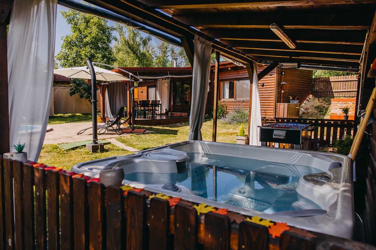 Ubicada en lo más profundo del bosque, nuestra cabaña ofrece total privacidad y paz. Tiene dos dormitorios, dos baños y un área de bienestar con bañera de hidromasaje, sauna y ducha fría. En el exterior, disfruta de una fogata y un parque infantil privado con tirolina, trampolín, columpios, saco de boxeo y kart todoterreno: diversión para niños y adultos. Una escapada perfecta para relajarse, recargar las pilas y reconectar con la naturaleza.