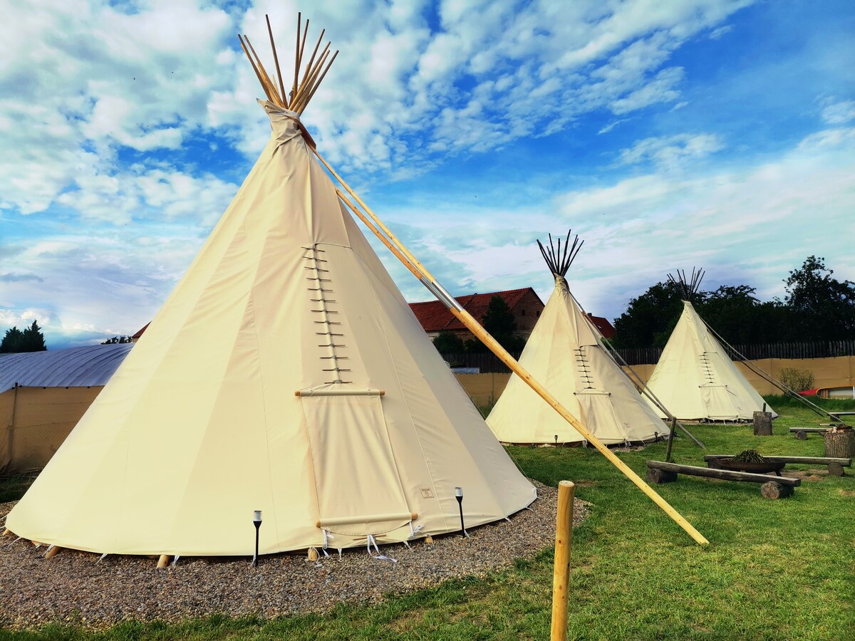 ¡Bienvenido a nuestro campamento nativo americano junto al río Labe! Aquí experimentarás una aventura única en tipis cómodos, equipados con camas totalmente amuebladas y una chimenea. Nuestro pequeño y acogedor campamento garantiza paz y privacidad, ideal para familias con niños, grupos o parejas. Ofrecemos un total de tres tipis individuales: dos con una capacidad de hasta cuatro personas y un tipi grande con una capacidad de hasta seis personas.