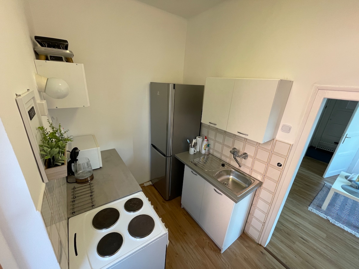 El departamento está ubicado en el centro histórico de Mělník, en la planta baja de una casa familiar. El apartamento está totalmente equipado: muebles, TV, conexión a internet - WIFI gratuito, mesa de comedor, sillas, cocina totalmente equipada (nevera con congelador, estufa de cerámica, hervidor de agua, microondas, todos los platos), baño privado, secador de pelo. Mělník es un lugar ideal para planificar otros viajes alrededor de la belleza de la región central de Bohemia, ya sea en bicicleta al valle de Kokořín o en coche/autobús a Praga (a unos 30 km).