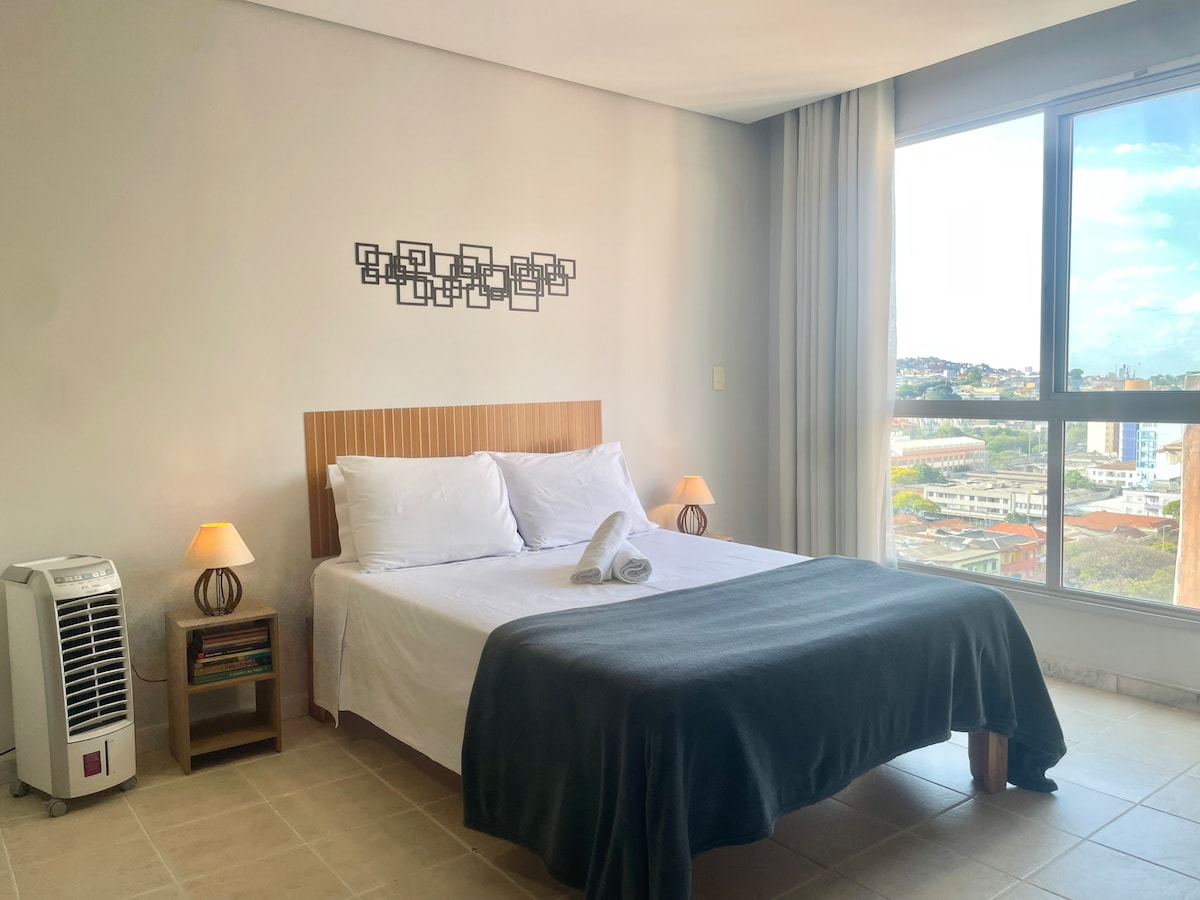 Loft de lujo, 45 m2, aire acondicionado, mesa para 4 personas y encimera, cocina completa y equipada, máquina de secado, máquina Nespresso y otros detalles. Muy espacioso con cama queen, 1 sofá cama y Smart TV 55'' con wifi y net. ¡Hermosa vista! Zona exterior común: Gimnasio completo, lavandería, piscina climatizada, jacuzzi y sauna. Ubicación privilegiada cerca de Diamond, Hosp. Materdei, Mercado Central de BH, Supernosso, etc. 1 plaza y portería 24 horas ¡Servicios para que te sientas como en casa!