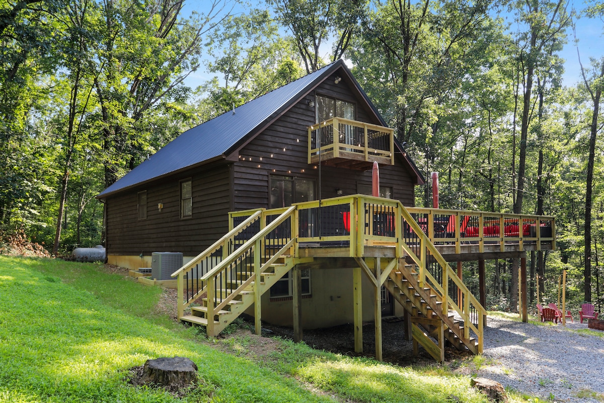 Preciosa cabaña de montaña de 4 dormitorios y 2 baños ubicada en el fascinante entorno forestal de Berkeley Springs, WV. A solo unos minutos del impresionante Sleepy Creek, su fantástica ubicación ofrece una escapada perfecta del ajetreo y el bullicio cotidianos. El diseño elegante y la rica lista de servicios te dejarán asombrado. Acceso al✔ arroyo ✔ Jacuzzi ✔ Pesca/Kayak ✔ Se admiten mascotas. ✔ 4 dormitorios (3 cabinas principales + altillo del garaje) Cocina ✔ completa. ✔ Cubierta, patio, comedor, barbacoa, fogata ✔ Televisores inteligentes Wifi ✔ de alta velocidad ✔ Estacionamiento