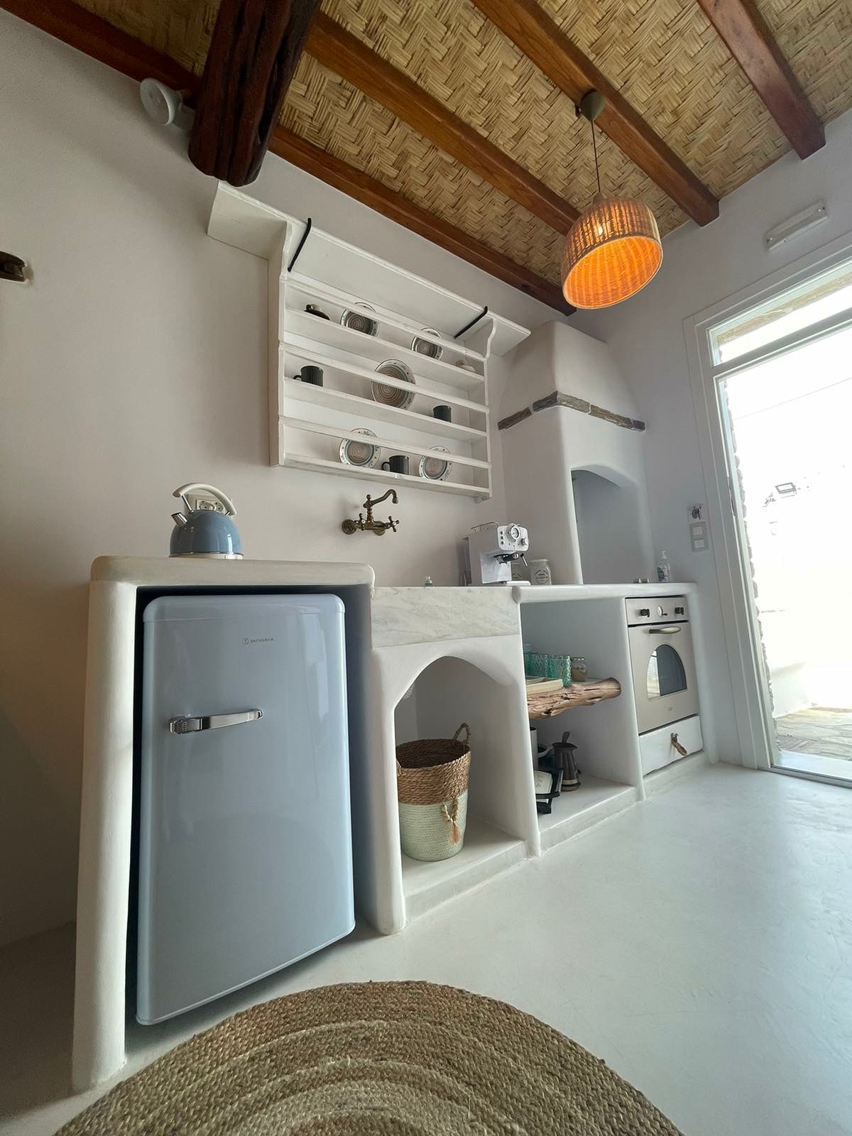 Nuestra casa fue construida en 2010 siguiendo la arquitectura de las casas de Chora Kythnos. Tiene 75 m², consta de salón, comedor, cocina, un baño con ducha (planta baja), altillo con sofá cama, 2 dormitorios dobles, uno con baño propio, terraza y azotea. También tiene un pequeño almacén y un espacio auxiliar con lavadora. Con una ubicación privilegiada, ya que se encuentra a pocos metros de la calle principal de Chora, con todas las tiendas, pero al mismo tiempo en un barrio tranquilo.