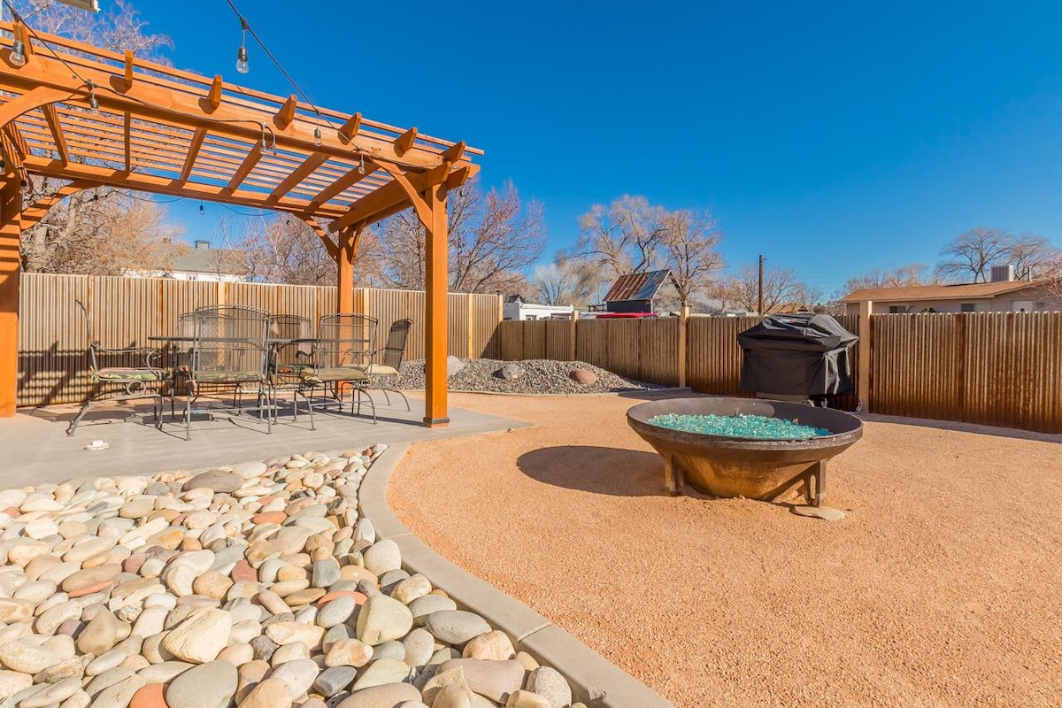 ¡Base de aventuras en Fruita! Casa adosada espaciosa para 9 huéspedes, minutos de senderos de ciclismo de montaña y Monumento Nacional de Colorado. Garaje seguro para bicicletas, pérgola cubierta, parrilla BBQ, fogata, ping-pong y dardos. Patio cercado para mascotas. Comodidades familiares: cunas portátiles, sillas altas, juguetes. ¡Excelentes reseñas de familias aventureras! Refugio perfecto después de explorar senderos o viñedos de Palisade.
