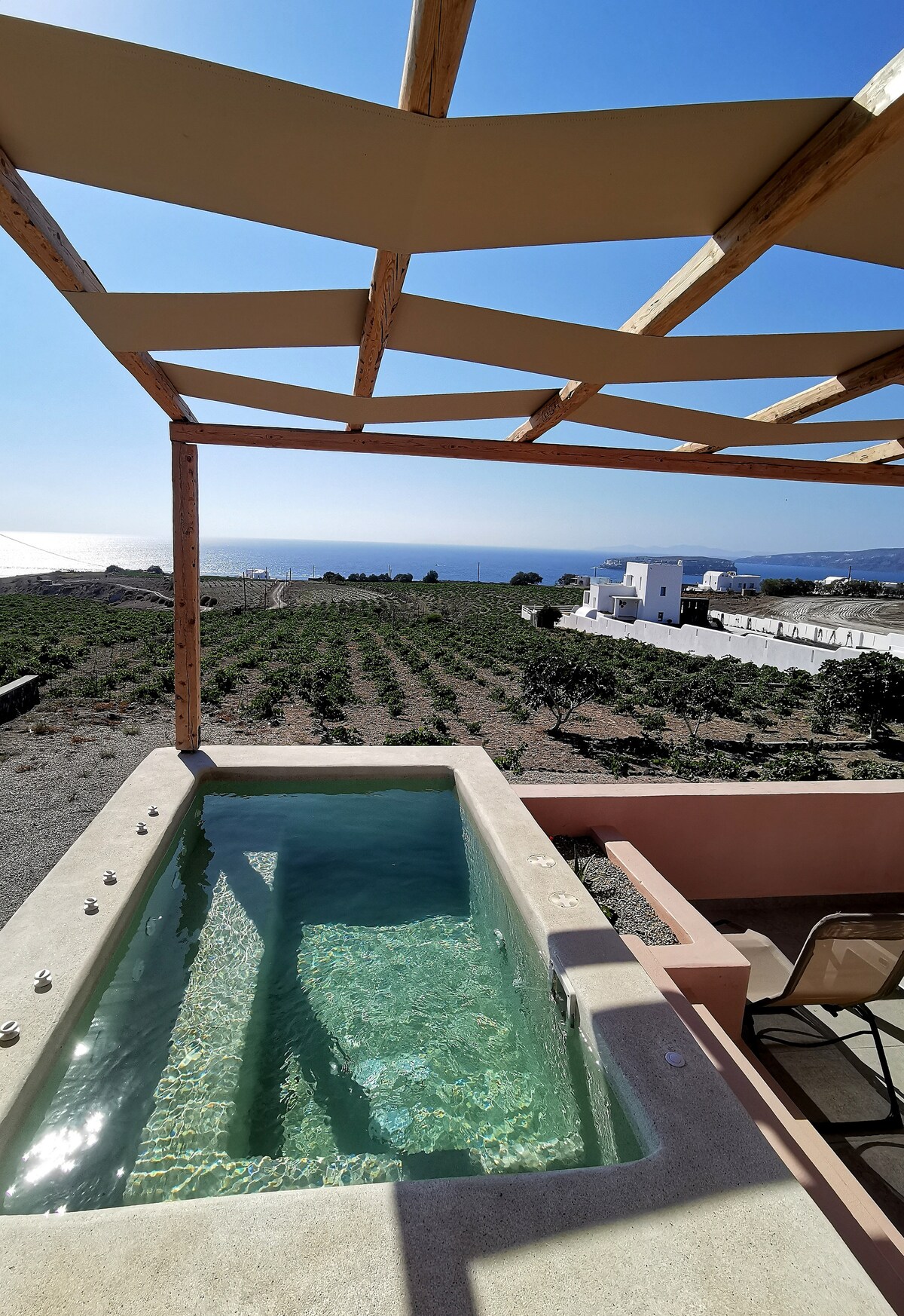 Ambeli Sunset Villa's unique allocation provides the famous sunset view of the caldera avoiding the overcrowding of the well-known cities of Santorini. A newly anti-seismic constructed building covering all the official guidelines to maximize the security of our guests. Depending on the chosen room type that fits you, guests will experience the use of the heated pool or the hot tub in maximum privacy as no facilities are public.