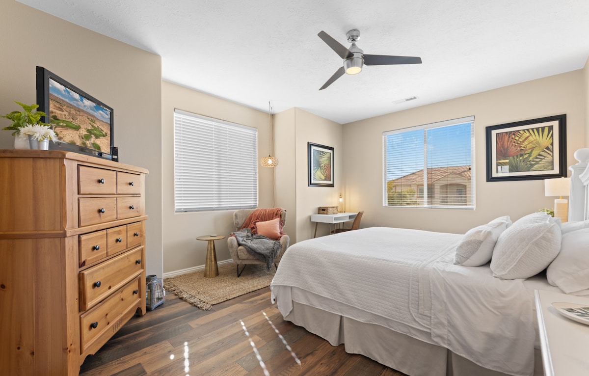 Apartamento en St. George con mucha diversión. Piscinas, pickleball, baloncesto, voleibol de arena, minigolf, equipo de ejercicio/gimnasio, y esto es solo en el apartamento. Senderismo, ciclismo, Zion, paseos en barco, surf de remo, dunas de arena, paseos en UTV, Tuachan, Snow Canyon, cascadas de Kanarraville y mucho más que hacer. Tal vez solo necesites un lugar tranquilo para relajarte o un lugar para conectarte al wifi y trabajar un poco. Todo es posible aquí en este apartamento.