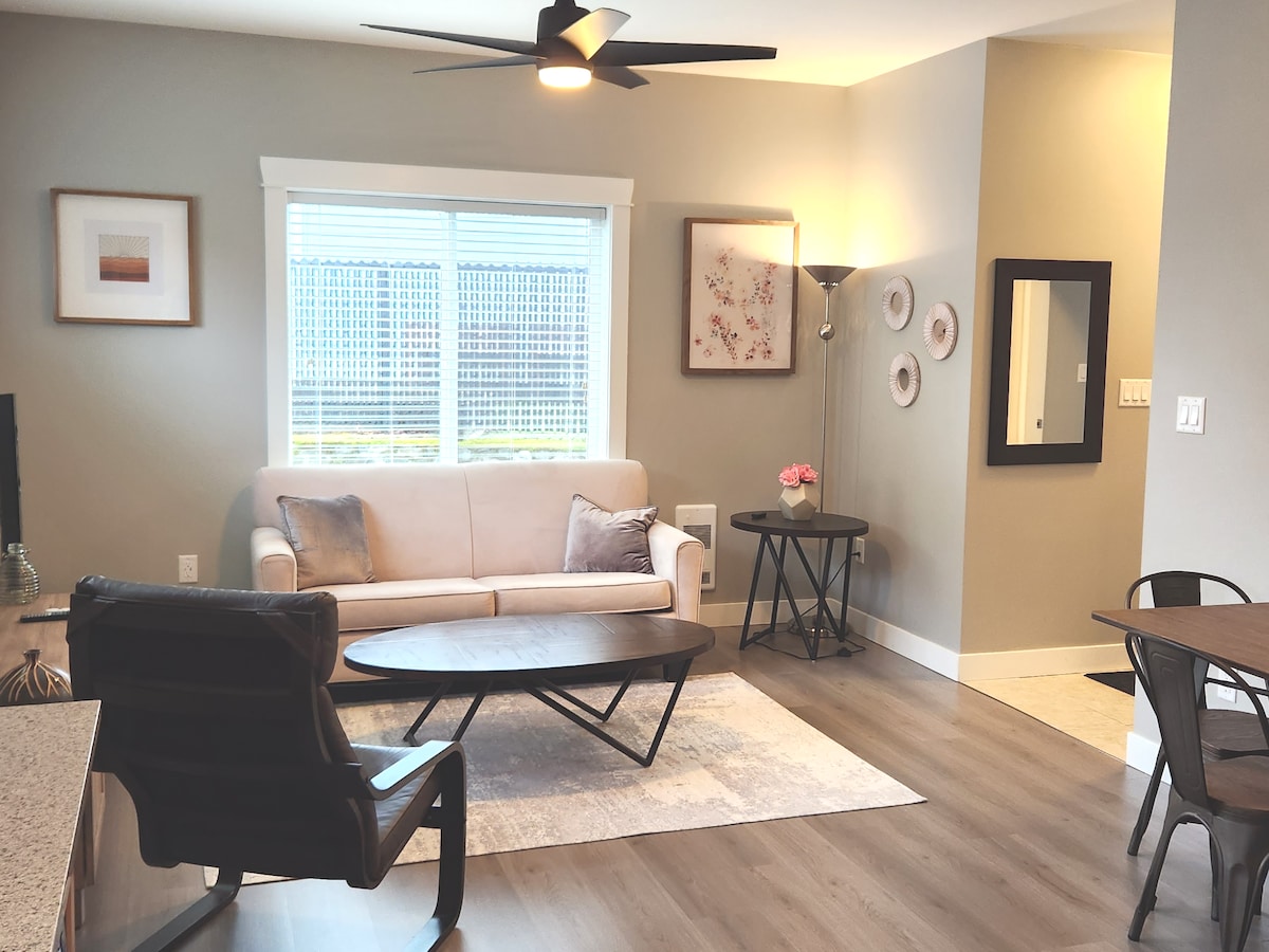 Discover a modern oasis in Happy Valley, Langford! Our private suite, with a separate entrance, offers comfort and convenience, just 5-10 minutes from the ocean, parks, landmarks, trails, and local stores and restaurants. Enjoy a cozy living room, fully equipped kitchen, comfortable bedroom, in-suite laundry. Relax in the spacious shared backyard with a serene farm view. With all high-quality furniture and thoughtful touches, this is your ideal getaway. Book now for an unforgettable stay!