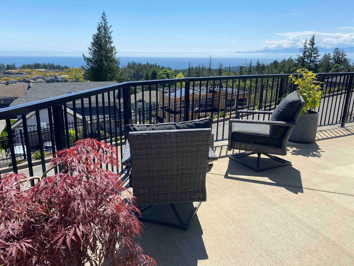 Come enjoy a romantic get-away with a PRIVATE - 3 person HOT TUB and gorgeous view. *GAS FIRE PIT with couch and loungers *BATHROBES & SPA TOWELS *FULLY stocked kitchen *In-suite laundry *Super fast EV Charger WALMART, SUPERSTORE & RESTAURANTS all within a 5 min drive *25 minute drive to Downtown Victoria We are a family of 4 working professionals that live upstairs. You will hear footsteps upstairs but we are very respectful when we have guests. **NO PARTIES or Other Guests allowed