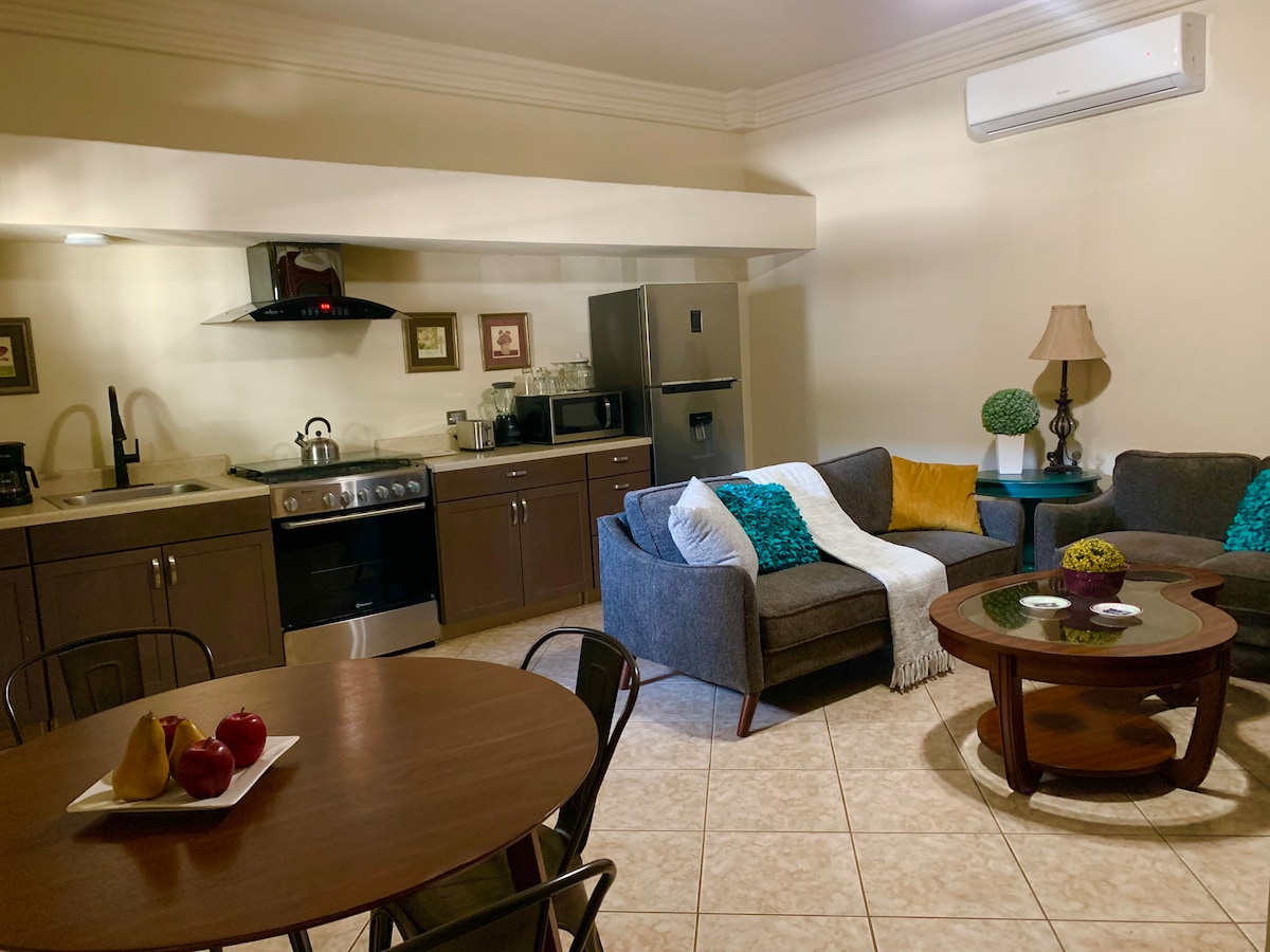 Departamento moderno en area segura ideal para estancias comodas ubicado a corta distancia caminando de bancos restaurantes gimnasio y zona hotelera perfecto para viajeros de negocio o descanso cuenta con espacios funcionales iluminacion agradable y ambiente tranquilo estacionamiento disponible sobre la acera cercano a todos los servicios necesarios para una experiencia practica accesible y confortable en la ciudad. Ubicado en segundo piso.