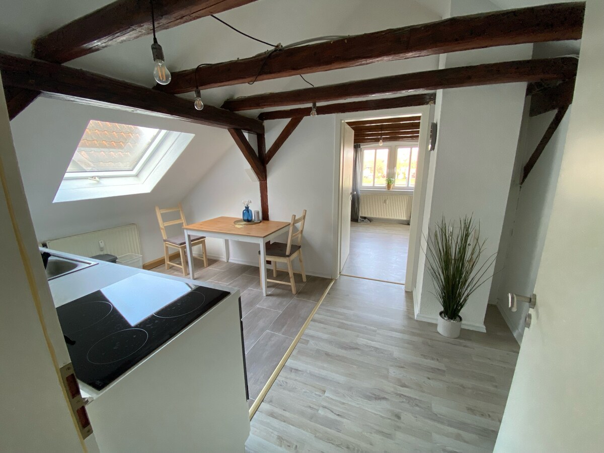 Vives en un ático recién renovado con 70 metros cuadrados y una cocina totalmente equipada. Ofertas adicionales: - Almacenamiento cubierto con cerradura para bicicletas. - Uso del jardín vallado. - Aparcamiento cerca de la casa. - Cama de invitados cómoda. - Servicio de pan - Refrigerador completo el día de llegada. - Lavadora / Secadora. Ubicación: - A 10 minutos a pie de la estación de tren. - zona residencial tranquila - Ubicado en el centro de la ciudad, a pocos pasos.