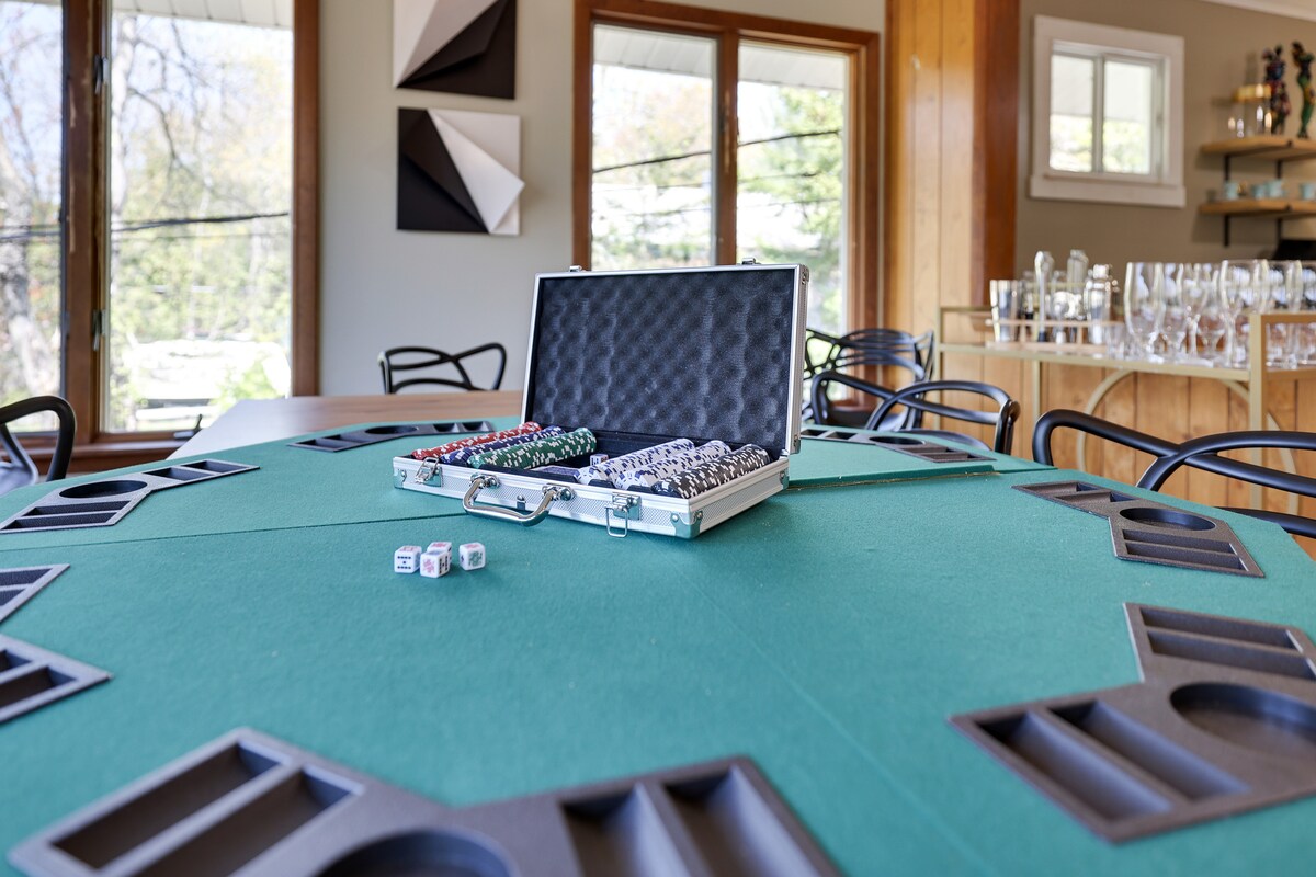 Tendrás un sinfín de actividades para disfrutar en esta espaciosa joya de 4 dormitorios y 3 baños frente al lago. La casa ofrece un jacuzzi para 6 personas, una playa privada con sillas, kayaks, una chimenea de leña y una parrilla de gas en la terraza, junto con varios comedores y zonas de estar al aire libre. En el interior, relájate en la sala de juegos con juegos de arcade y una mesa de futbolín, o prueba suerte en la mesa de póquer junto a la barra seca. Para los entusiastas del fitness, hay un gimnasio y una sauna de infrarrojos para ayudarte a sudar.