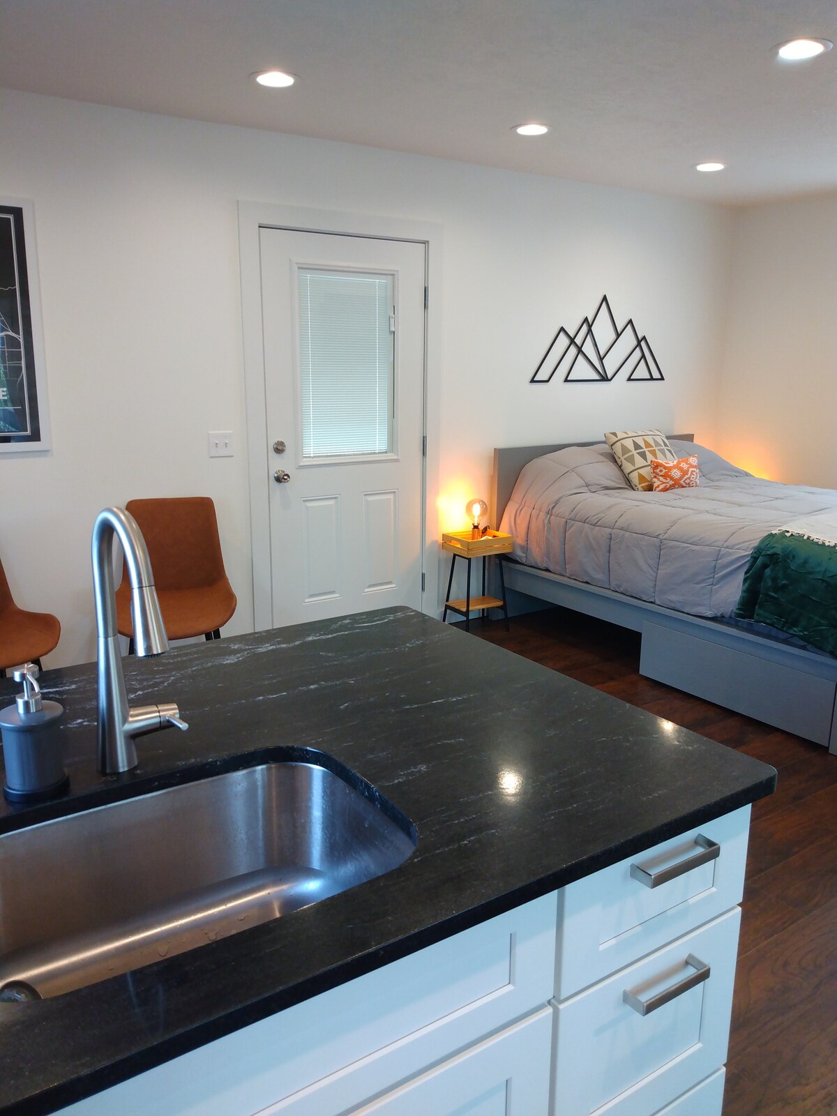 ¿Necesitas un lugar para relajarte, descansar y desconectar? Esta suite de invitados con cama tamaño queen es el lugar perfecto para hacer las tres cosas. De nueva construcción y ubicación céntrica, esta suite se encuentra a poca distancia en auto del centro de la ciudad o del esquí y aventuras en la montaña. ¿No te apetece salir? Está de suerte, ya que hay todo lo que necesita dentro de esta unidad. Incluimos una cafetera Keurig completamente surtida, bebidas y golosinas, una máquina de hielo, una mininevera e incluso una estación de trabajo para que puedas trabajar a distancia. NO SE PERMITEN ANIMALES