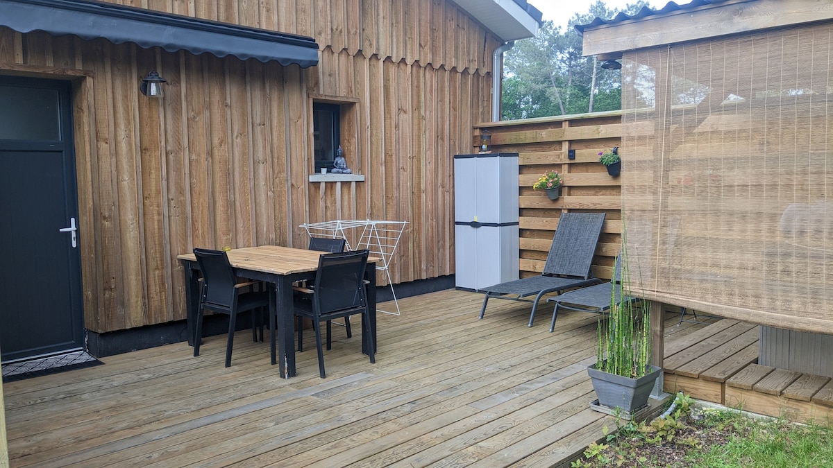 Si desea descubrir la bahía de Arcachón, sus ostras, sus cabañas tchanquées y la duna de Pilat o dar un largo paseo con los pies en el agua por las playas de las Landas, remar en canoa para un descenso de la Leyre hasta la bahía, estaremos encantados de recibirle en nuestro acogedor estudio totalmente equipado y tranquilo situado en el borde del bosque, donde podrá relajarse en su spa privado después de un buen día de paseo o de descanso.