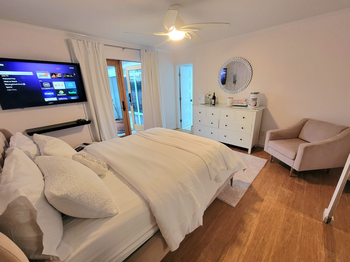 La espaciosa casita/casa de huéspedes independiente cuenta con entrada privada y patio trasero. Cuenta con un dormitorio grande, vestidor, baño completo, salón comedor y cocina. La cocina tiene un fregadero nuevo, estufa/horno, neveras, utensilios de cocina esenciales, utensilios y vajilla. La casa tiene una cama tamaño queen que puede alojar a dos adultos, un sofá cama nuevo y un colchón de aire tamaño queen para huéspedes adicionales. Los huéspedes pueden utilizar la nueva unidad combinada de lavadora/secadora LG.
