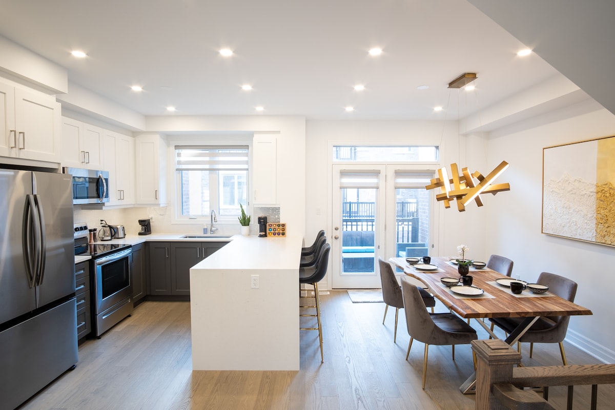 ¡Elegante casa adosada contemporánea a estrenar en Oakville! El refugio perfecto tanto para familias como para amigos. Le encantará el impresionante cine en casa con una pantalla de 115 pulgadas. Áreas amplias, cocina totalmente equipada y 4 habitaciones cómodas. ¡Sillón de masaje relajante para su uso! ¡Disfrute de la terraza en la azotea! Es el lugar perfecto para relajarse después de un largo día de turismo o para disfrutar de una noche bajo las estrellas. ¡Cerca de tres autopistas principales (403/407/QEW) en una ubicación céntrica!