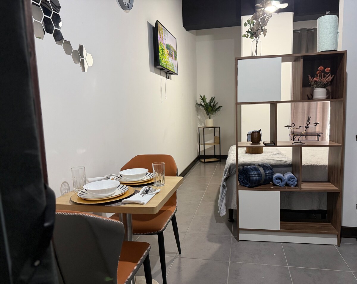 Moderno, con parqueo privado, Internet de alta velocidad, ideal para trabajar remotamente. Tiene un dormitorio donde pueden dormir comodamente una pareja, y en la sala hay un sofa cama para que duerma comodamente otra persona, con un pequeño costo adicional, y una Smar TV para ver Netflix o similar. El edificio cuenta con muchas amenidades, estacionamiento privado para un auto sin costo y recepción disponible las 24 horas.