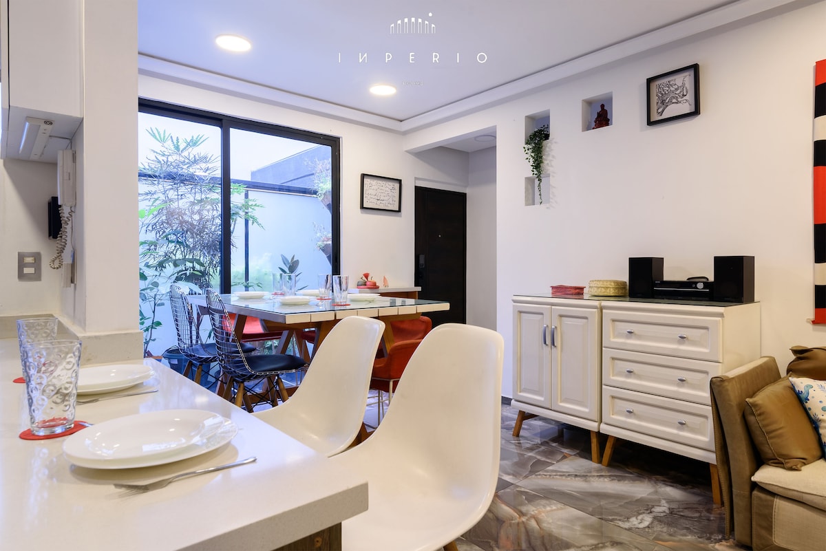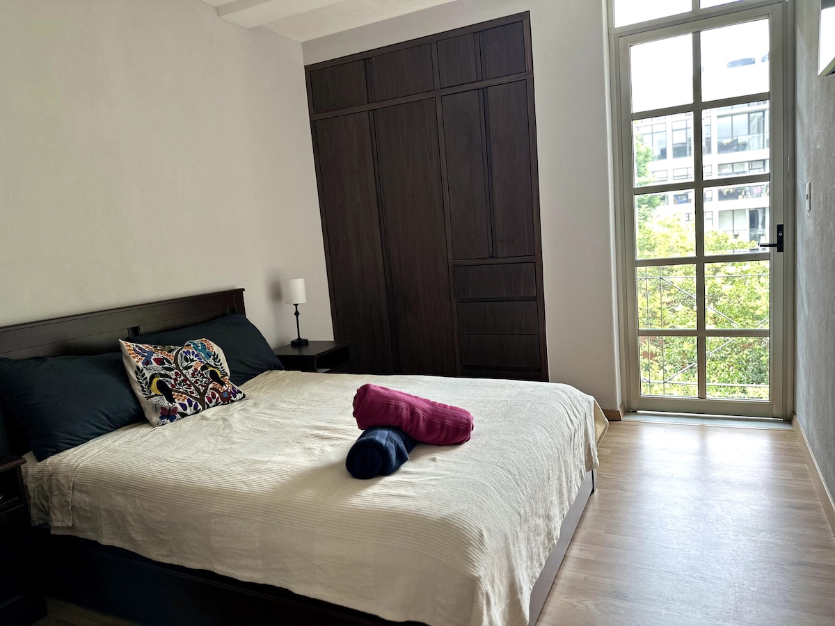 Enjoy Mexico City in our beautiful apartment, ideal for tourism or business trips. With excellent natural lighting, ventilation and privacy. You can enjoy a 360o landscape of the city in our private roof garden. The location, very close to the subway (40 mts) local market, park, restaurants and public transportation, allows to live our Mexican culture. Very well located in one of the most emblematic neighborhoods in the city, 5 mins away from WTC, Plaza de Toros and Condesa-Roma corridor.