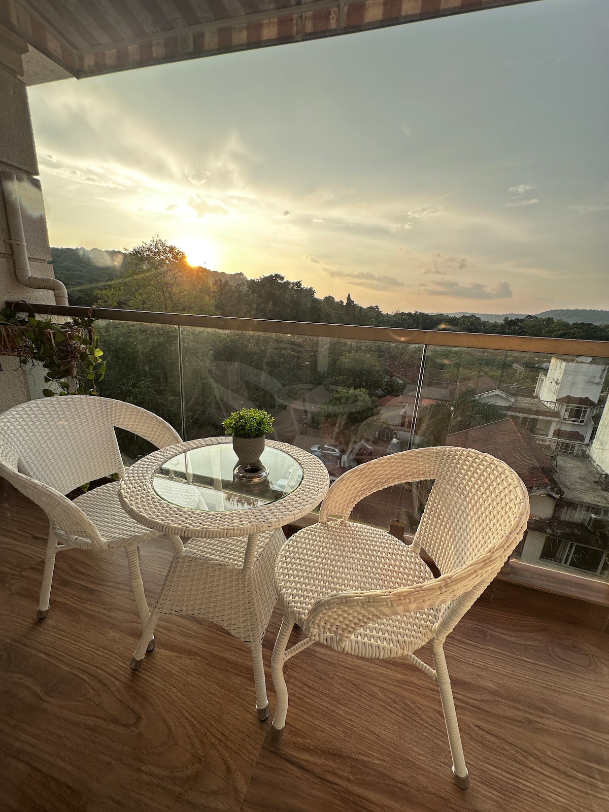 Certificado por Goa Tourism Apartamento con aire acondicionado de 950 pies cuadrados: 2 dormitorios, 2 baños, TV/sala de estar, cocina abierta; lavandería + Espacio de 500 pies cuadrados sin aire acondicionado: comedor para 4 personas; solárium; patio sombreado; balcón al aire libre. Internet de 300 mbps; 4-5 horas de energía de respaldo; Smart TV de 50"; libros; juegos de mesa; estación de trabajo y aparcamiento cubierto Ubicado en Porvorim: 15 minutos de Panaji/Mapusa; 25 minutos de Calangute/Baga; 30 minutos de Anjuna/Vagator; 45-60 minutos Ashvem/Mandrem/Arambol; 60-75 minutos en las playas del sur de Goa; 120 minutos de Palolem