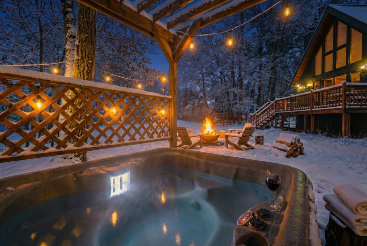**Clasificado como el "Mejor Airbnb en PA" por House Beautiful, 2022** Ven y alójate en uno de los chalets más encantadores de los Poconos. Esta casa de 2 dormitorios (más un loft para dormir)/2BA es elegante, apta para familias y bien equipada con todo lo que necesitas. Aire acondicionado para mantenerte fresco en verano y una estufa de pellets para esas acogedoras noches de invierno. Un cómodo sótano tiene una estufa de leña adicional y una mesa de ping pong. En el exterior hay una gran terraza, una bañera de hidromasaje para tres personas y una chimenea al aire libre.