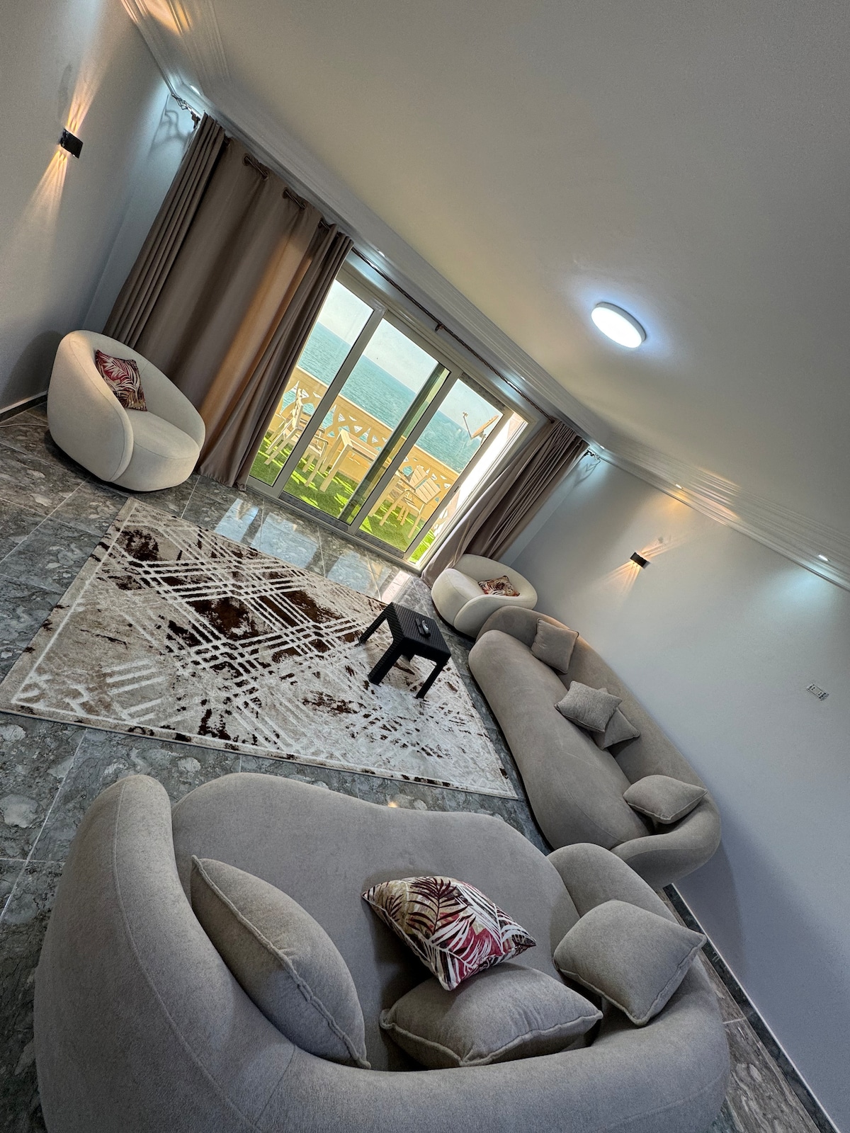 Apartamento de lujo ubicado en Al Mamoura Compound en Alejandría , primera línea de playa , a pie se puede llegar a la playa y pasar un buen tiempo en las instalaciones incluyen (actividades marinas, restaurantes, cafeterías). Esta propiedad se encuentra en el complejo Al Ma 'moura Beach y se considera la primera fila en el mar. Es posible llegar al Corniche y a las playas de Al Ma 'mora en 2 minutos a pie , y hay una gran variedad de restaurantes, cafeterías y varios juegos marinos disponibles en la playa.