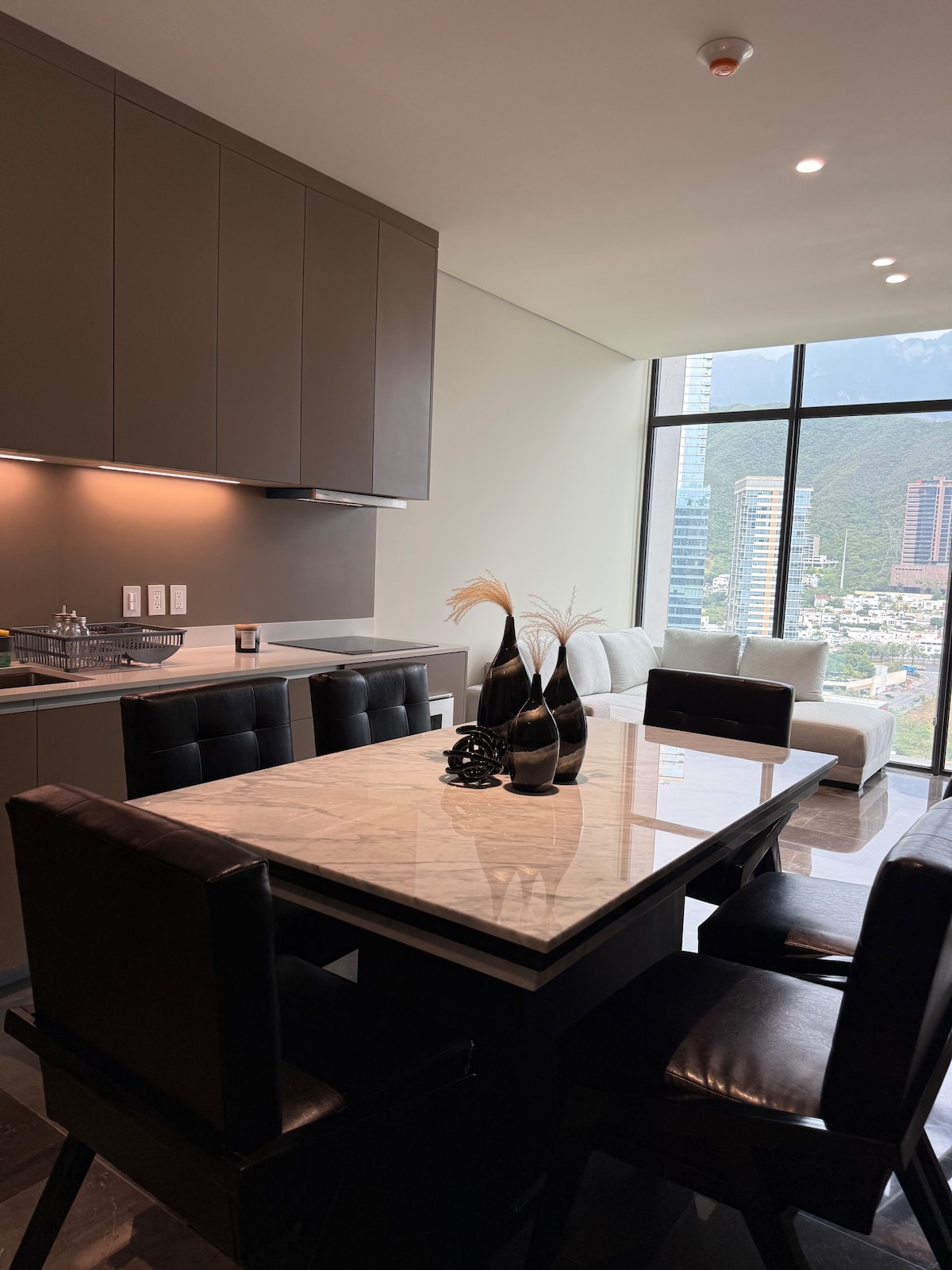 Disfruta de este lujoso penthouse con acabados y muebles de lujo, increíbles vistas hacia las montañas, ubicado dentro de las zonas más exclusivas de San Pedro Garza García a tan solo minutos de los centros comerciales y restaurantes más exclusivos de la ciudad, la torre cuenta con aún más amenidades como alberca, sala de cine, salas de juegos, salas de juntas, gimnasio, salones de eventos, salón de cine, todo a disposición de nuestros inquilinos.