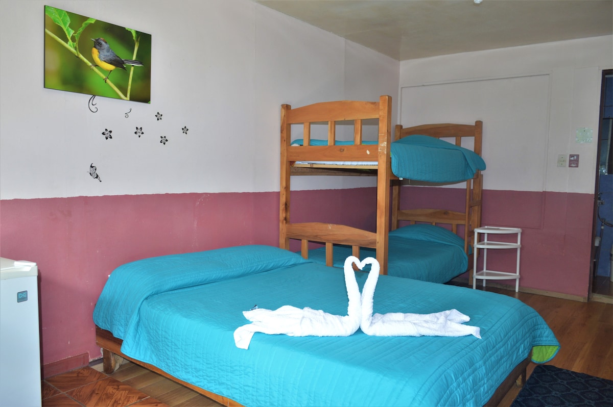 somos un hotel pequeño con una capacidad de hasta 21 personas maximo,y nuestro mayor objetivo es darle al cliente una atencion personalizada, le ayudamos con las reservaciones de la mayoria de los atractivos de la zona de monteverde. contamos con un amplio parqueo,las habitaciones son amplias, desayuno casero y delisioso,wifi gratis, nuestra ubicacion esta perfecta porque no esta lejos de los atractivos pero tampoco tan cerca y esto lo hace un lugar sumamente tranquilo para descansar.