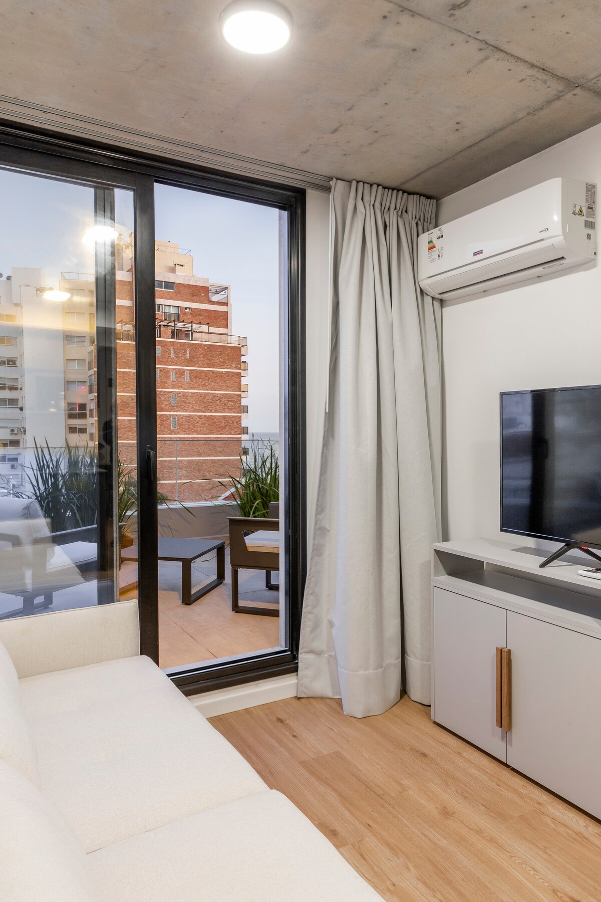 STUDIO EN PUNTA CARRETAS -Dormitorio con sommier queen size y TV Smart. -Aires acondicionados-Split Frio/Calor -Barra desayunadora con banquetas -Sábanas y toallas de alta calidad -Cocina totalmente equipada (Dolce gusto, vajilla alta gama para 4 personas) -Placard -Caja de seguridad electrónica -Plancha y tabla de planchar
