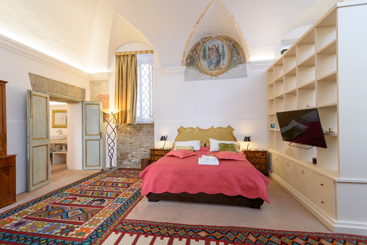 Está cerca de la estación Termini, la Basílica de Santa María la Mayor, el Coliseo, la Fontana di Trevi, el Foro Romano, el metro Cavour y a 20 minutos a pie de la Piazza di Spagna. Te gustará: el brillo, la comodidad de la cama, la privacidad y los techos altos. Mi alojamiento se adapta a parejas, viajeros de negocios y familias. El departamento es único, está en el tercer piso y tiene ascensor; se encuentra en un edificio antiguo e histórico renovado, las habitaciones son amplias y tranquilas, con techos abovedados que están frescos con flores y groteserías. Un impuesto municipal se pagará en efectivo a la llegada: 3,5 euros por día, por persona.