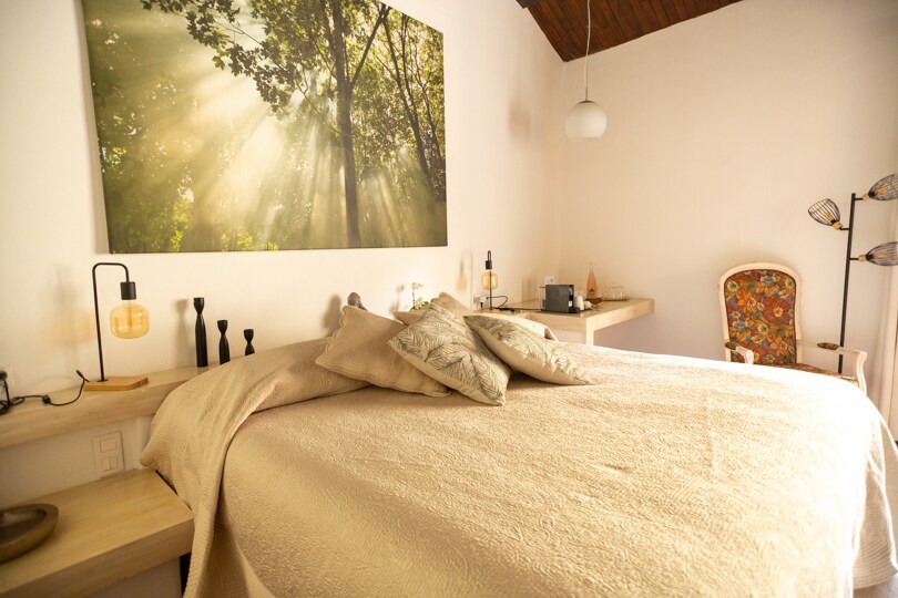 La Maison Soleil es una antigua casa reformada, situada en pleno centro de la ciudad. Con un refinado diseño mediterráneo, este hotel combina encanto histórico y confort moderno. Esta habitación abuhardillada y luminosa, decorada con detalles de artesanía local, ofrece un ambiente cálido y relajante. Ideal para una escapada relajante, la Maison Soleil promete una experiencia auténtica.