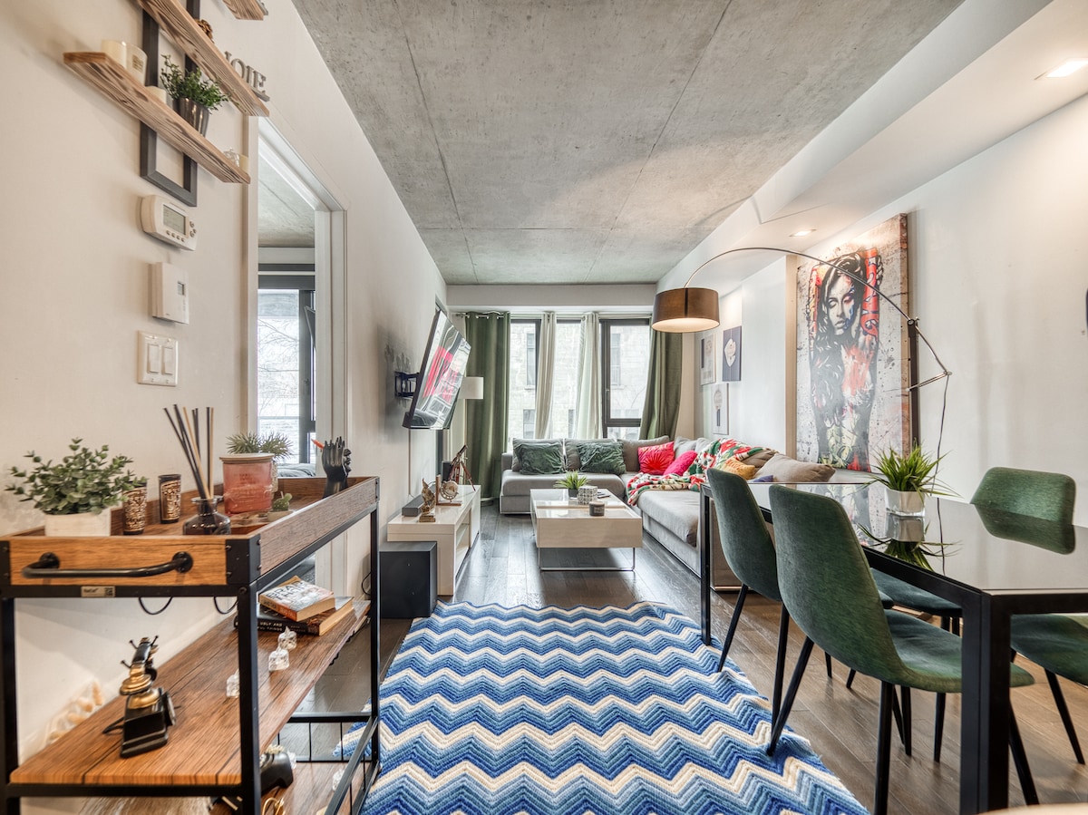 ¡Apartamento situado en pleno centro de la ciudad con acceso directo al Bell Center! Disfruta de tu estancia con lujo y comodidad en un apartamento de un dormitorio totalmente amueblado que incluye café, tostadora, hervidor de agua y todos los utensilios de cocina gratuitos. ¡Sauna, piscina, gimnasio con numerosas pesas y máquinas, salón panorámico, sala de juegos, salón y terraza con múltiples barbacoas a tu disposición! ¡Disfruta de un aparcamiento subterráneo gratuito y de un acceso a 1 minuto al sistema de metro sin tener que poner un pie fuera! Netflix incluido.