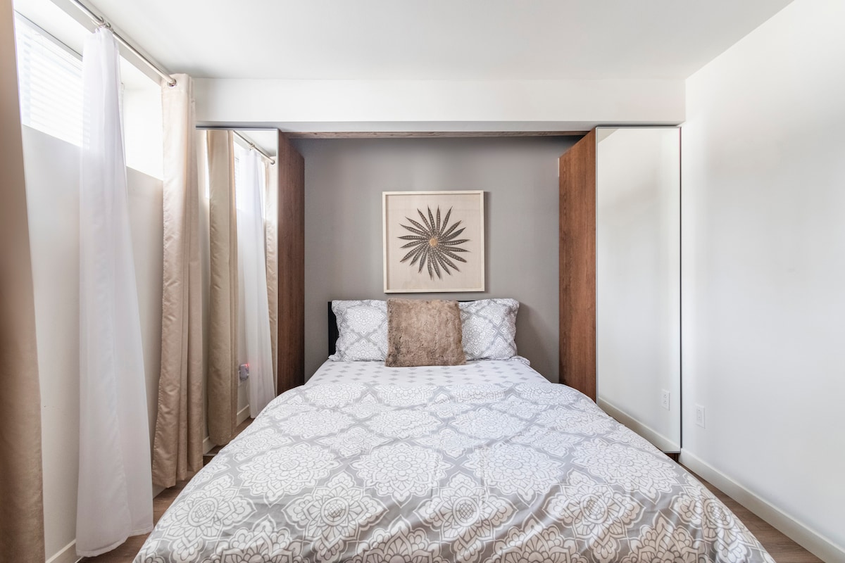Apartamento privado de dos habitaciones con una cama tamaño king. Wifi potente, TV inteligente, toallas, sábanas limpias, nevera, placa de inducción portátil (realmente eficiente de Ikea), dos placas de calentamiento, microondas, minihorno, ollas y sartén. También hay un lavabo junto a la cama que puede que no aparezca en algunas fotos. También tienes acceso a una lavadora y secadora en otra habitación que compartes con nosotros, ya que vivimos en el mismo edificio. La cama real es la que ves en las últimas fotos, también tamaño king.