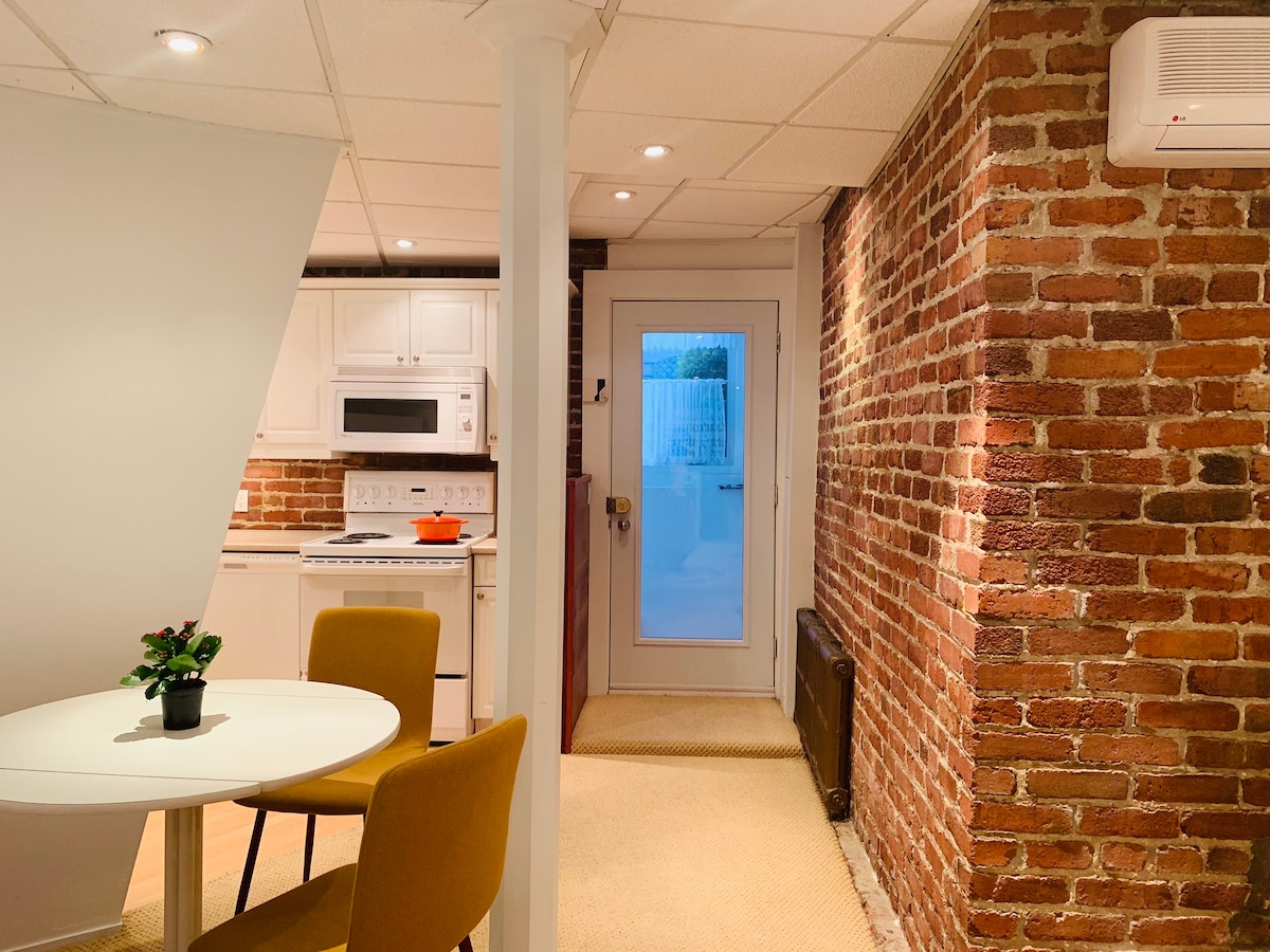 Estudio con cama doble, cocina pequeña, baño privado y entrada privada al apartamento. Muy buen vecindario, a 10 minutos a pie de la estación de metro Jolicoeur, que está a 8 estaciones del centro de la ciudad (15 minutos). Muy amable y hospitalario. Medio sótano. La escalera no es muy grande (un poco más pequeña que las escaleras normales). El techo es más bajo de lo normal, 6 pies y 7 pulgadas (2 metros). ¡No apto para más de 2 personas! Perfecto para estadías cortas.